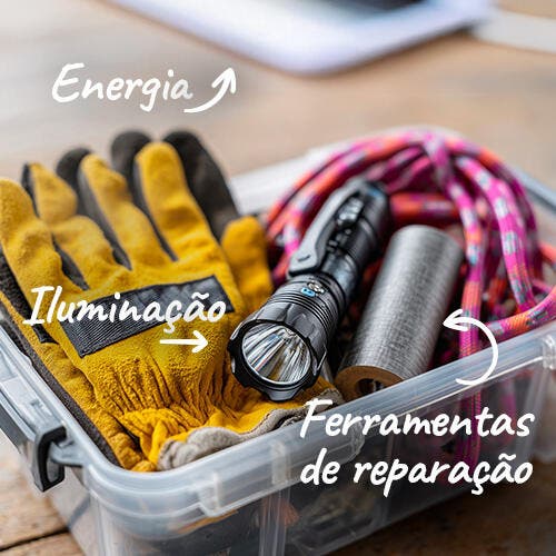 - Ferramentas para reparações rápidas, como fita adesiva de reparação, fita adesiva de vedação, fita de reparação de infiltrações em telhados, lona e plásticos de proteção e bolsa com ferramentas básicas.