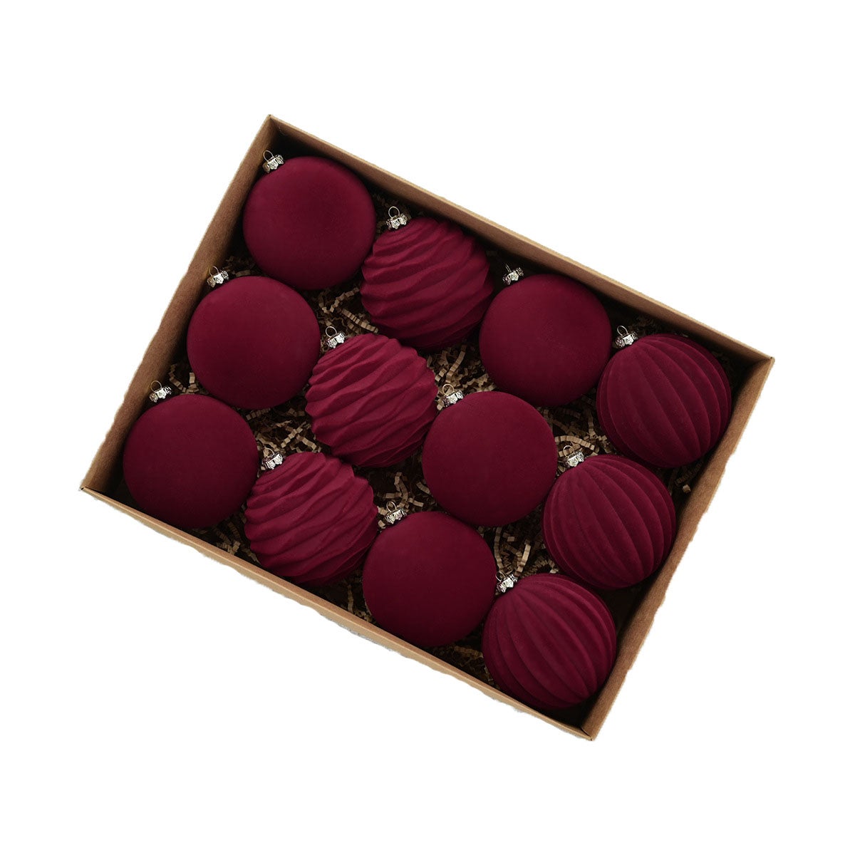12 peças de decorações de bola de Natal retro requintadas, bolas de Natal de veludo, 8 cm, cor de vinho