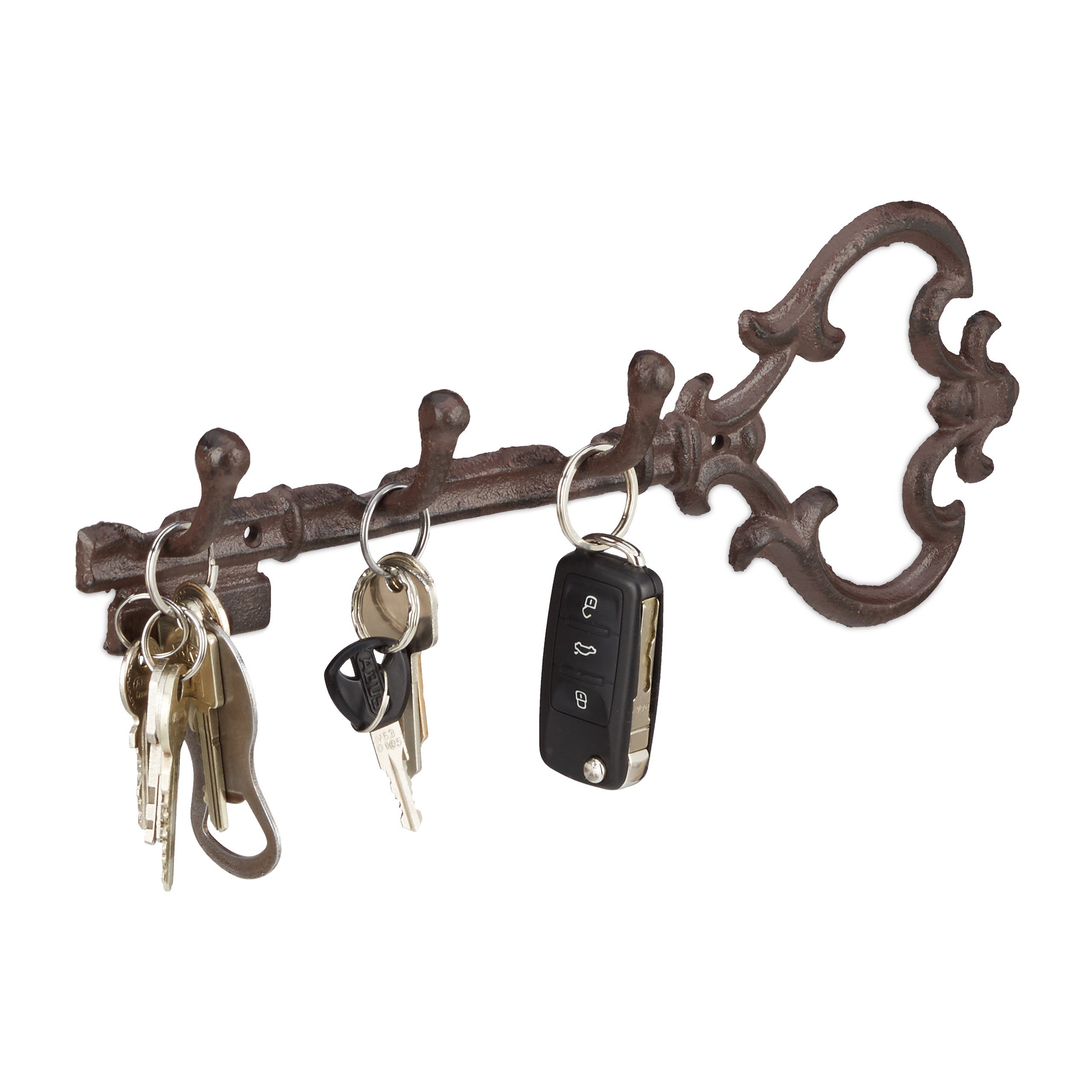Suporte de Chaves em Detalhe - Dimensões A x L x P: aprox. 12,5 x 33 x 4,5 cm - Distância entre os ganchos: aprox. 6 cm - Carga máxima: aprox. 3 kg - Peso: aprox. 400 g - Material: ferro fundido - Cor: castanho - Conjunto de 5 unidades