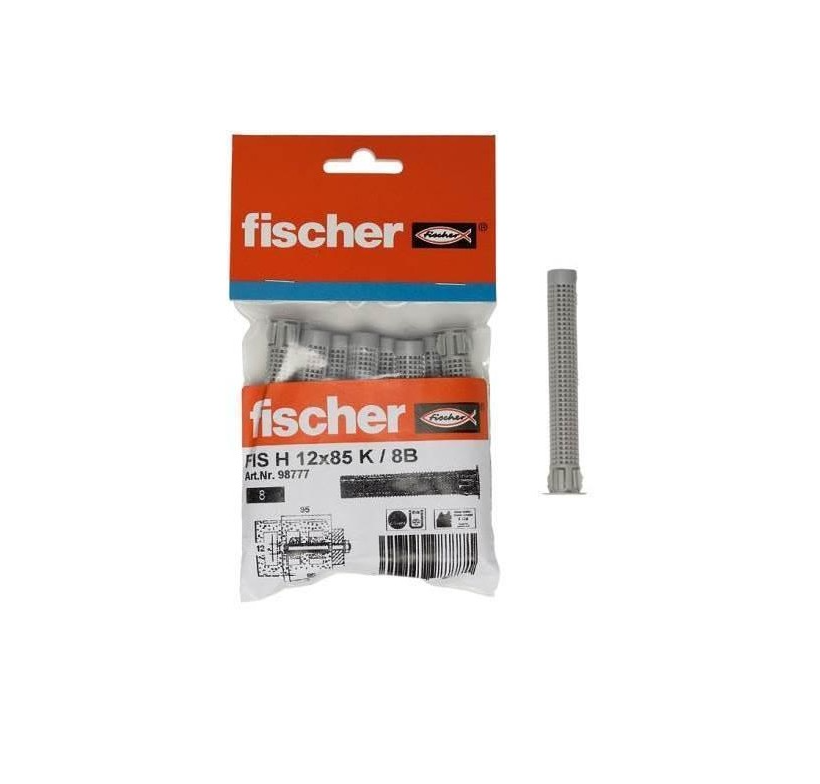 A camisa para químicos de injeção Fischer FIS H K de plástico é o componente de sistema para a utilização das resinas de injeção Fischer em alvenaria de tijolo perfurado, em instalações de encaixe. Para tal, a camisa é colocada no furo e preenchida com resina de injeção desde a sua base. Ao inserir o varão roscado ou o varão de rosca interna, a resina é pressionada contra a estrutura reticular, aderindo ao tijolo perfurado por meio de um bloqueio efetivo. Isto significa que a carga é transferida para a material de construção. Camadas não estruturais também podem ser transpostas com a camisa para químicos de injeção.