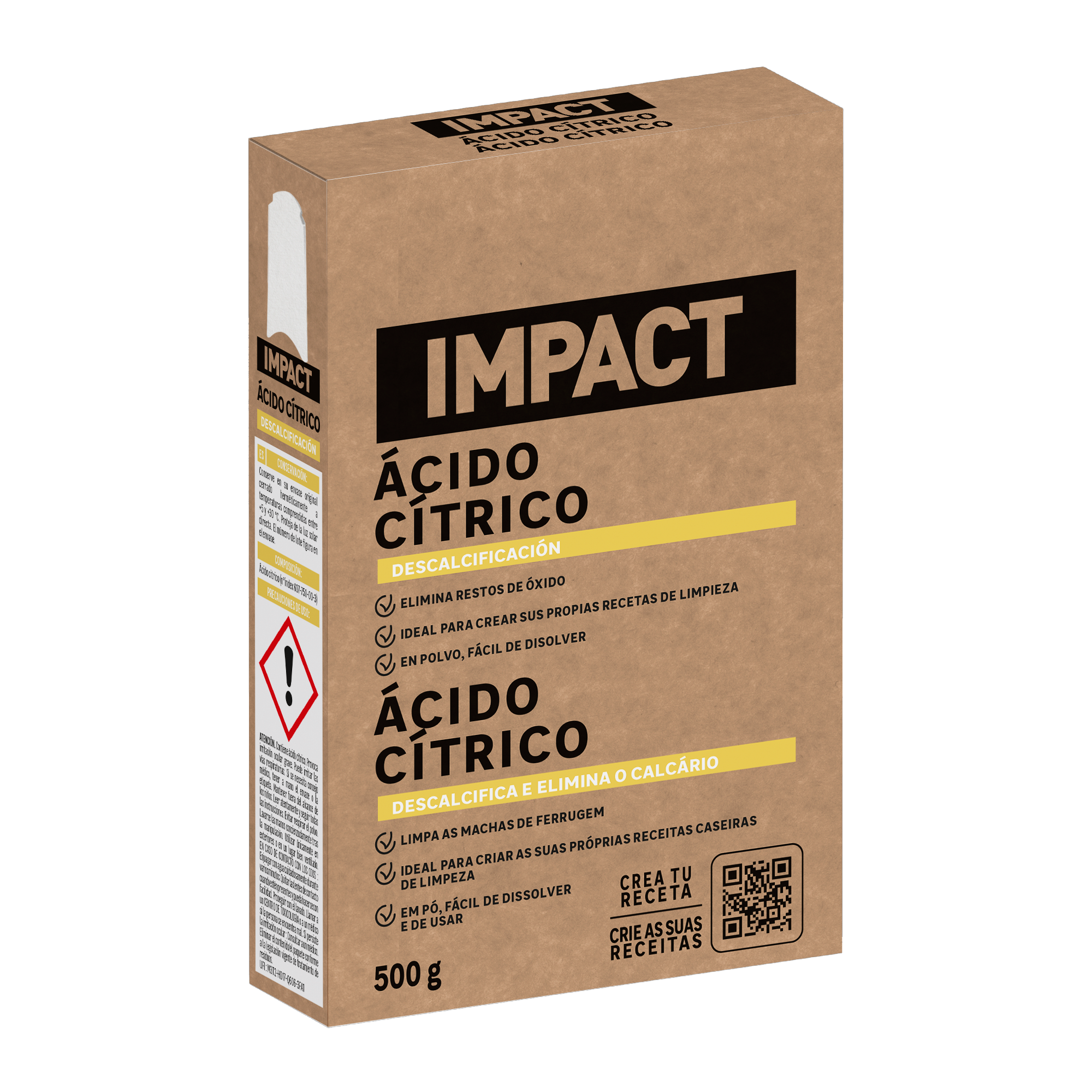 100% natural, o ácido cítrico é essencial para a manutenção da sua casa. O ácido cítrico Impact é ideal para descalcificar superfícies e remover eficazmente manchas de ferrugem. Descalcifica eficazmente máquinas de café, máquinas de lavar, chaleiras; limpa o fundo das panelas ou até elimina manchas de chá nas xícaras. Não utilizar em superfícies porosas ou sensíveis a produtos ácidos. Em caso de dúvida, faça um teste em uma superfície invisível