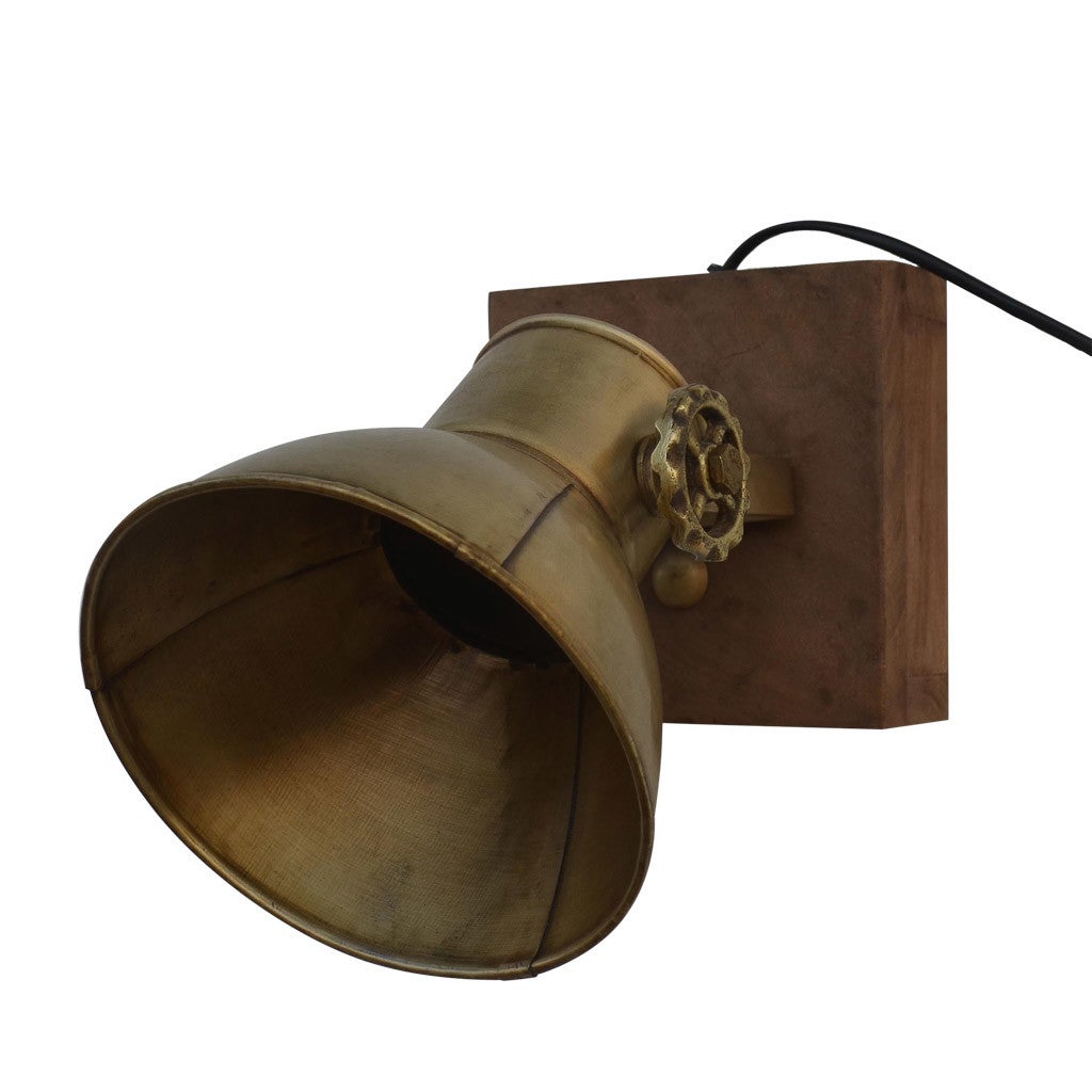 Aplique de parede de madeira e metal em tom dourado. Funde o calor da madeira com a elegância do metal dourado. A base de madeira contrasta com a estrutura de metal. Adiciona luxo e estilo.