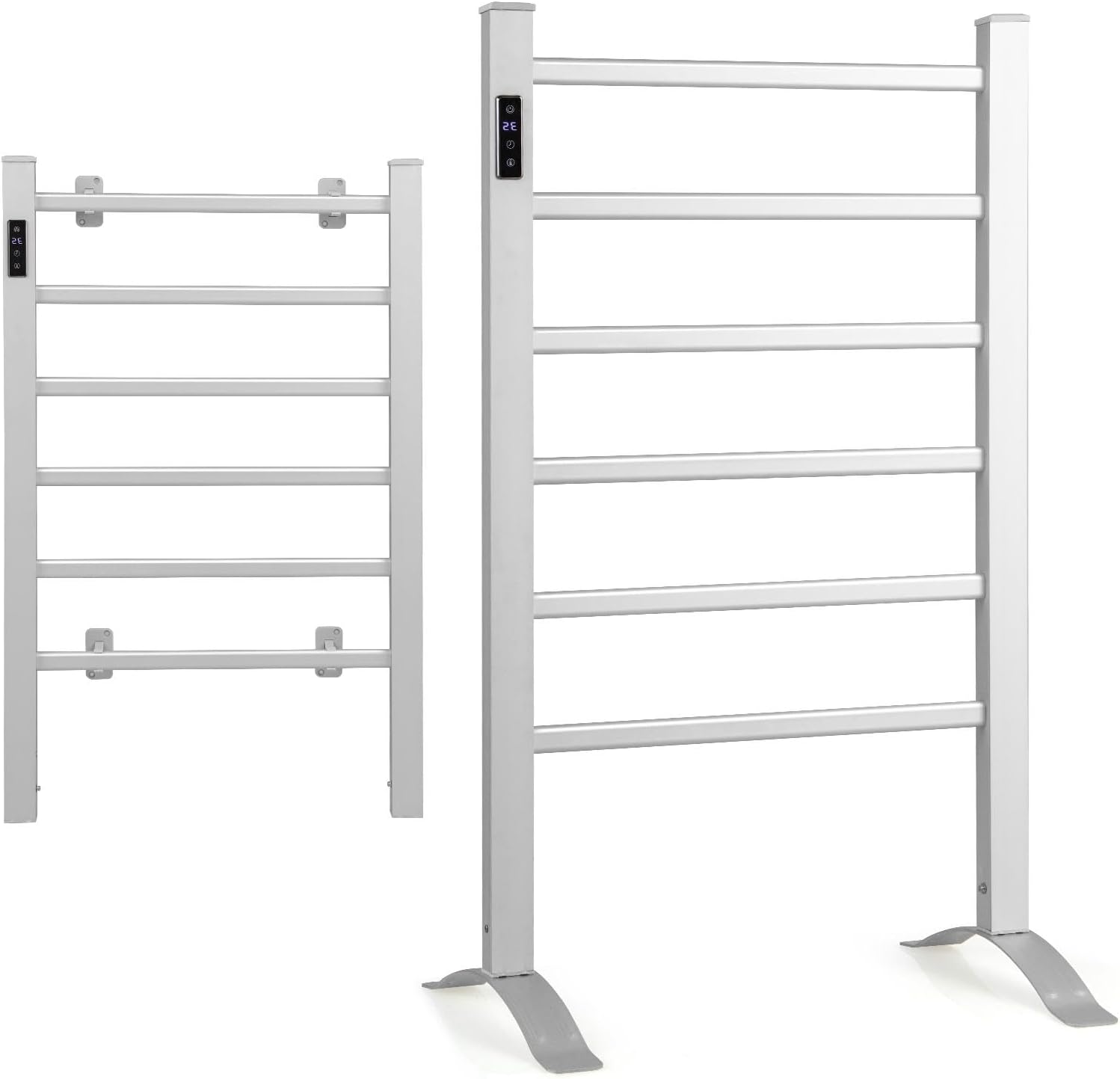 Aquecedor de Toalhas Elétrico de Parede ou de Chão com 6 Barras, Controlo de Temperatura Temporizador de 30-60°C e 1-8h, Aquecedor de Toalhas de Casa