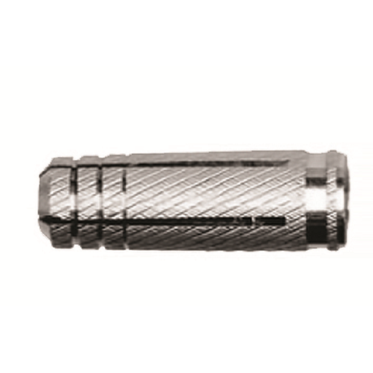 Bucha com rosca interior e com a superfície exterior rugosa, para proporcionar uma melhor aderência dentro do furo.