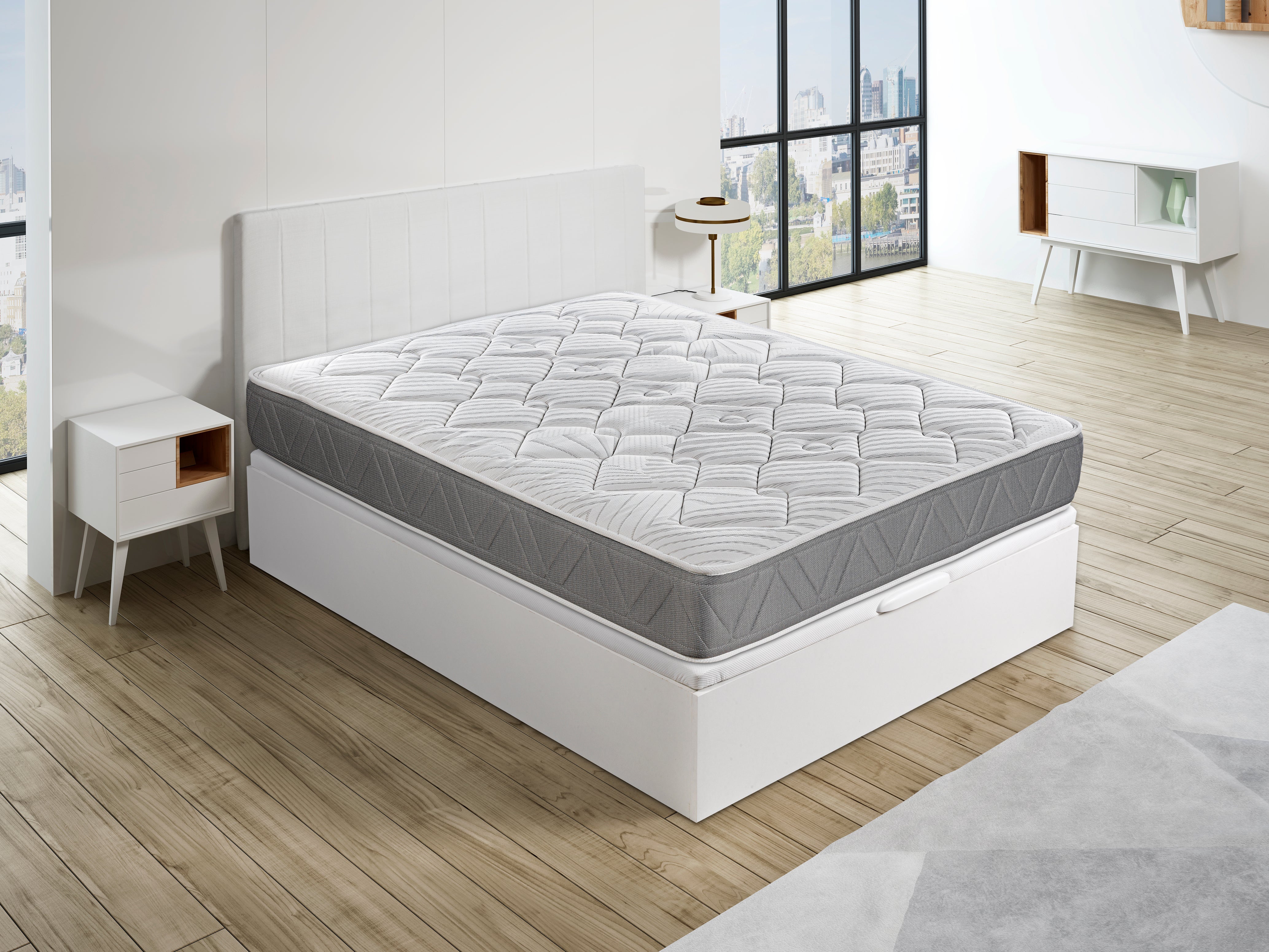 Por que se contentar com menos quando pode ter tudo? O pack Royal Sleep combina o colchão viscoelástico Ceramic e a cama box abatível Basic 1, projetados para oferecer o melhor descanso e maximizar o espaço do seu quarto. O colchão Ceramic foi desenvolvido para quem procura o melhor. O seu núcleo de espuma HR premium garante uma firmeza inteligente e duradoura, enquanto as camadas de viscoelástica proporcionam um conforto progressivo e aliviam a pressão em pontos-chave do corpo. Graças ao seu tecido biocerâmico com fio de carbono, o colchão contribui para uma regeneração celular mais rápida, melhora a circulação e dissipa a carga elétrica acumulada durante o dia, ajudando a reduzir o stress e proporcionando um descanso reparador. Além disso, o seu tratamento Higiene Total® garante proteção contra ácaros, bactérias e fungos, mantendo-o sempre limpo e saudável. A cama box abatível Basic 1 complementa este sistema de descanso. Com 31 cm de altura útil, transforma o espaço em baixo da cama num prático local de armazenamento adicional. A sua tampa estofada em tecido 3D respirável, com tecnologia Base Air System, garante uma ventilação ideal para o colchão. A abertura frontal com pistões a gás e puxador ergonómico facilita o seu uso diário, permitindo um acesso fácil às suas coisas. Disponível em cinco cores, a cama box abatível Basic 1 adiciona design e funcionalidade ao seu quarto, sendo fabricada com materiais de alta qualidade para garantir a sua durabilidade. Além disso, a sua base apoia-se diretamente no chão, evitando a acumulação de pó e melhorando a estabilidade. Para que possa desfrutar desde o primeiro momento, a Royal Sleep oferece um serviço Premium, que inclui entrega com marcação de hora, montagem profissional e recolha da embalagem e do antigo equipamento de descanso. Royal Sleep: durma melhor, viva melhor.