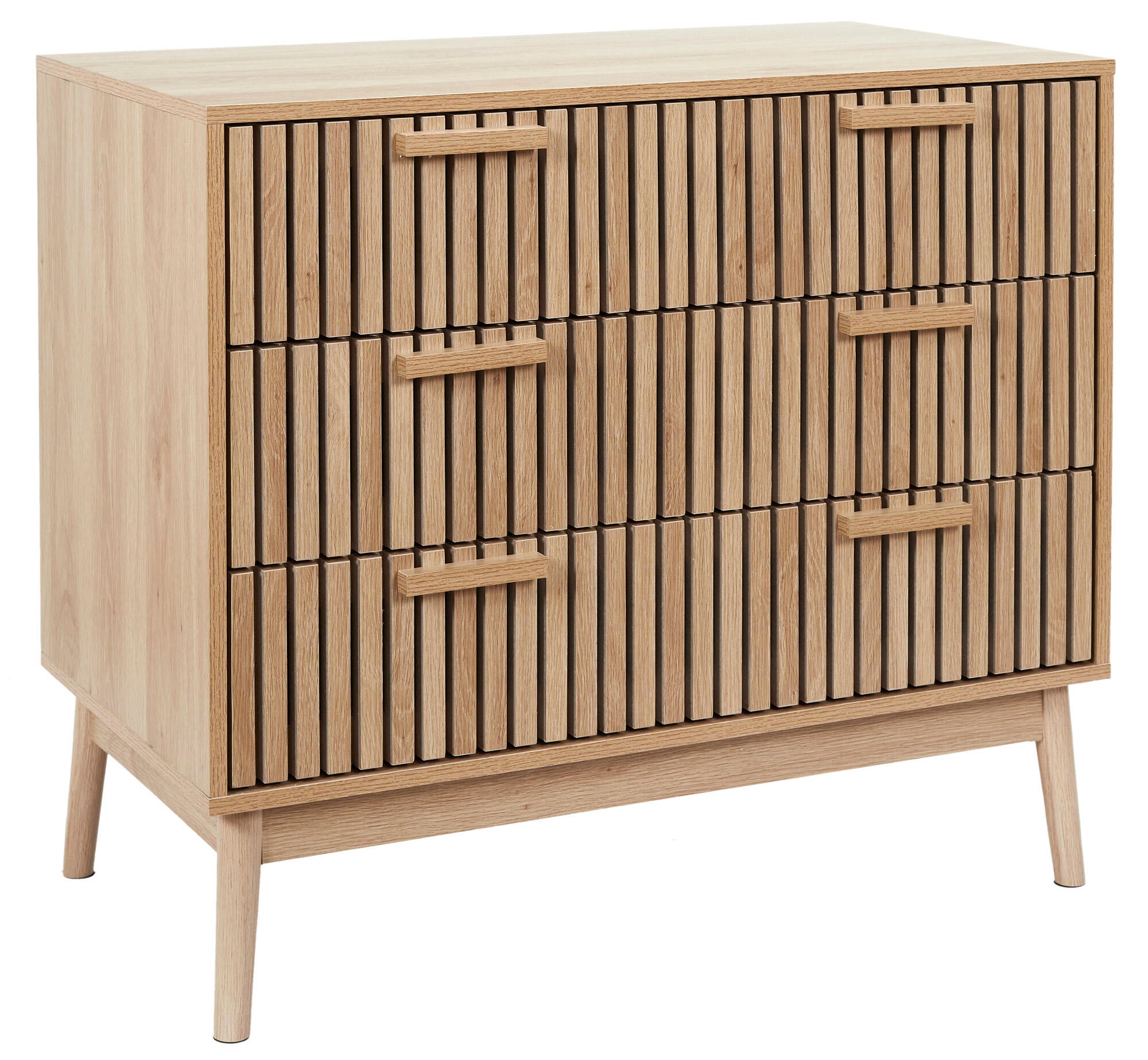 Vista a sua sala de estar ou quarto com estilo com a cómoda Klaus. Decorativo e funcional. Com três gavetas grandes com duas alças. Combine-o com outros móveis Klaus. Estrutura de painéis de partículas e MDF. Placa de MDF. Pernas de pinho.