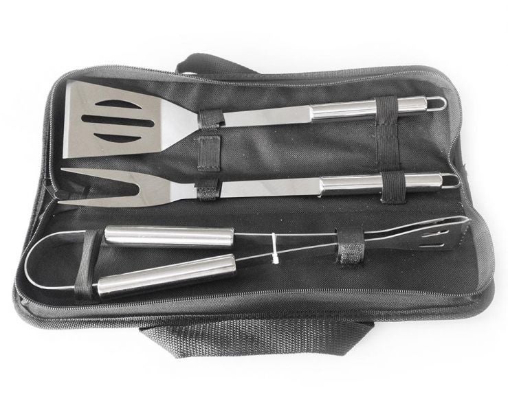 Conjunto de 3 ferramentas profissionais para churrasco totalmente em aço inoxidável, pinça, garfo, pá. Comprimento total das ferramentas: 35 cm. Inclui um confortável com alças para armazenamento e transporte.