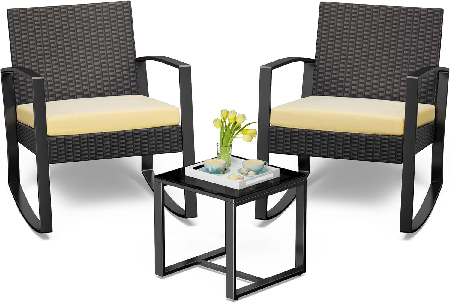 Conjunto de Jardim Bealife 2 Lugares, Cadeira Balançante de Aço com Colchonete, Mesa de Vidro Temperado, Exterior Bege