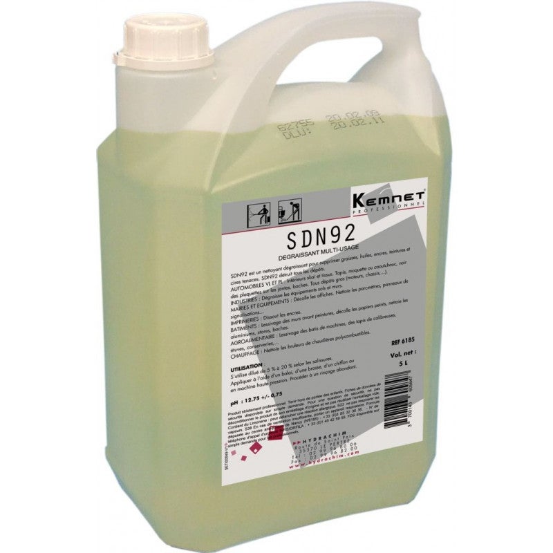 SDN92 é um limpador desengordurante para remover graxas, óleos, tintas, corantes e ceras teimosos. SDN92 destrói todos os repositórios. AUTOMÓVEIS LCV E HGV: Interiores em couro sintético e tecido. Carpete, carpete ou borracha, almofadas pretas nos aros, lonas. Todos os depósitos de gordura (motores, chassis, etc.). INDÚSTRIA: Desengordura equipamentos, pisos e paredes. DIVERSOS USOS: Dissolver tintas de impressão, lavar paredes antes de pintar, remover papéis de parede e cartazes, limpar alumínio, persianas, lonas, molduras de máquinas de lavar, correias de niveladoras, fornos, fábricas de conservas, etc. Manuais: Utilizar diluído de 5% a 20% dependendo da sujidade. Aplicar com vassoura, pincel, pano ou máquina de alta pressão. Enxágue bem.