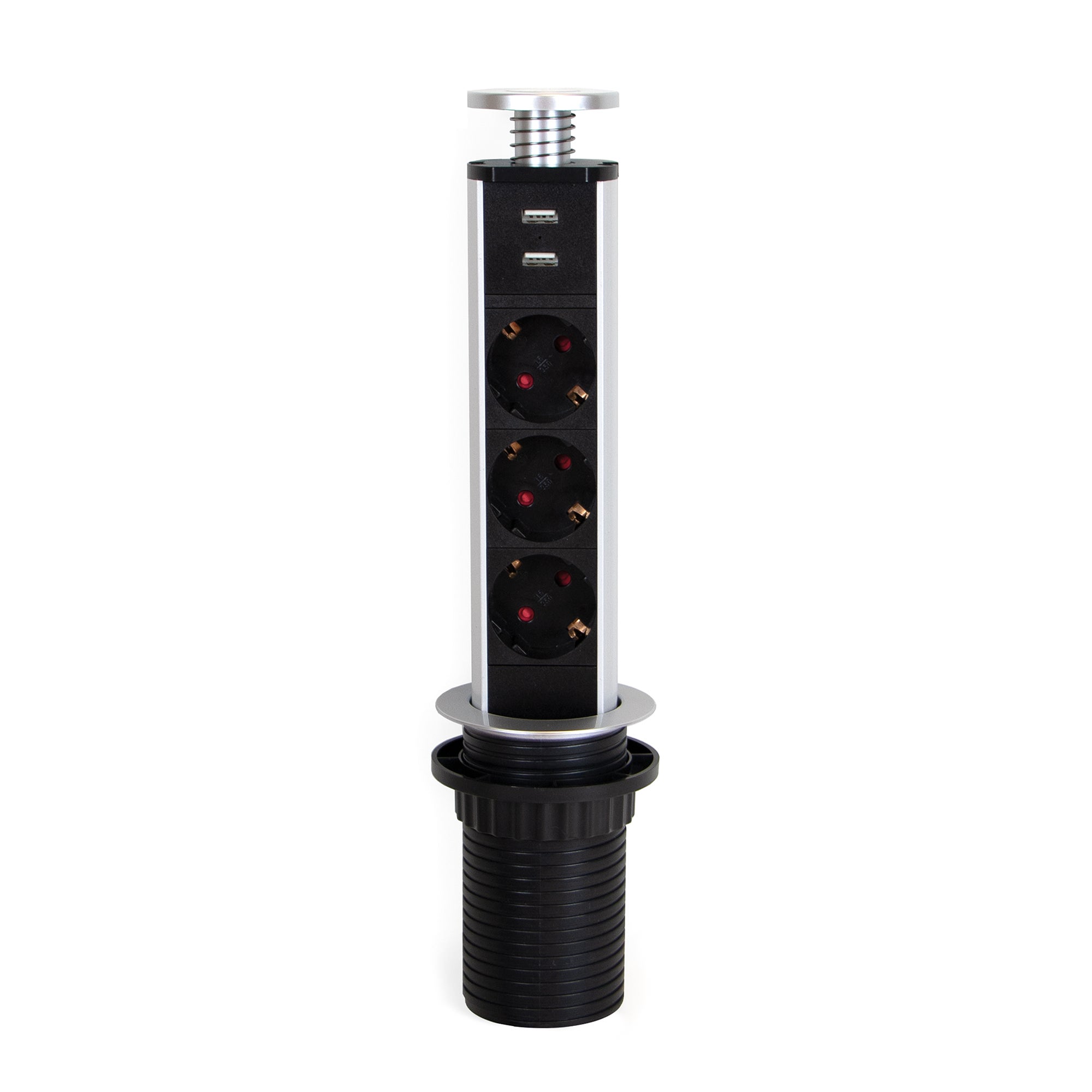 Conector multitomada ou torre de tomadas elevável (extraível verticalmente) desenhado para conferir funcionalidade com a sua completa integração no móvel de cozinha, escritório e lar. Está pensado para ser encastrado tanto em módulos superiores como em módulos inferiores graças ao seu desenho retráctil de fácil extração e ocultação manual. Adapta-se perfeitamente aos escritórios já equipados com passacabos. Dispõe de três tomadas de tipo Schuko com uma Potência máxima admisível de até 3500W – 16A e de dois conectores USB para carregar dispositivos electrónicos 5V DC (1 x 1A / 2 x 0,5A) ideais para recarregar smartphones e tablets. A sua instalação resulta muito versátil dado que apenas requer uma mecanização de D. 60 mm e tem a possibilidade de poder montar-se em superfícies com grande espessura, entre 1 e 95 mm. Além disso fixa-se ao móvel sem necessidade de utilizar quaisquer ferramentas graças a uma porca de fixação manual. Da mesma forma dispõe de um discreto indicador LED de acendimento e um cabo de 1,8 m com ficha macho para se poder ligar directamente a tomadas de 230V AC 50Hz.