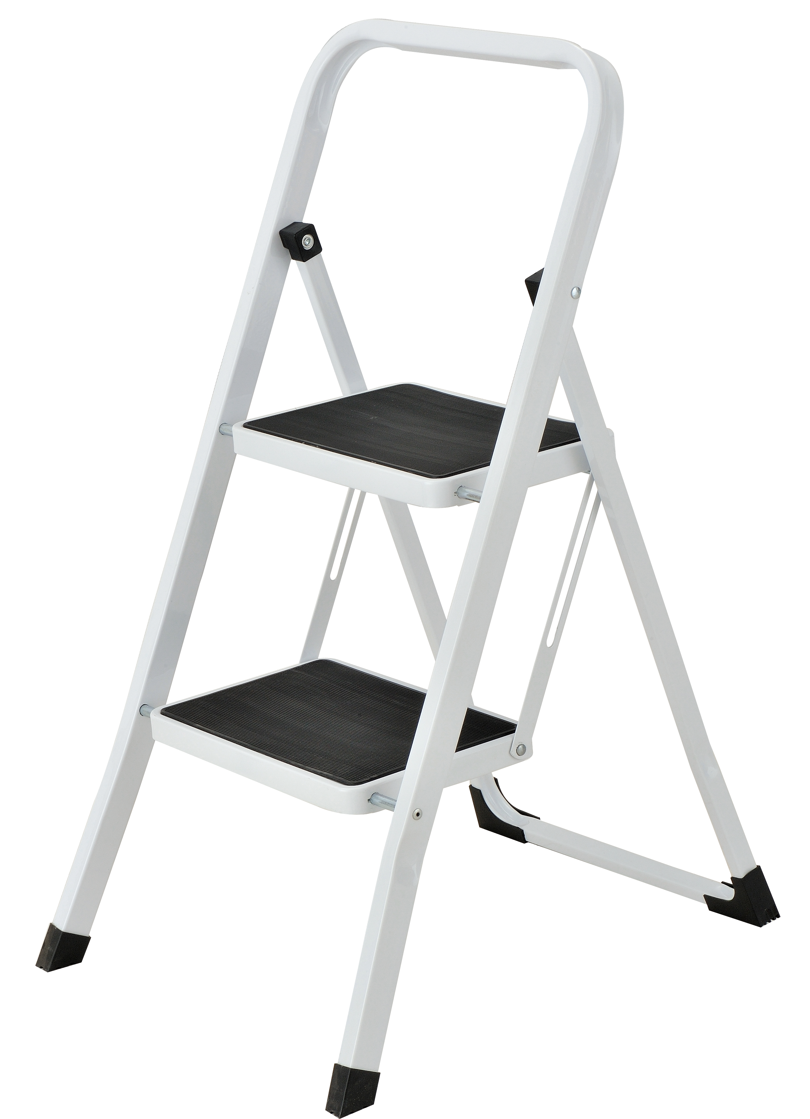 Escadote de aço branco com dois degraus rebitados de 20 cm de largura. Perfeita para uso doméstico, pode ser dobrada para facilitar o armazenamento quando não estiver em uso. Suporta uma carga máxima de 150 kg.
