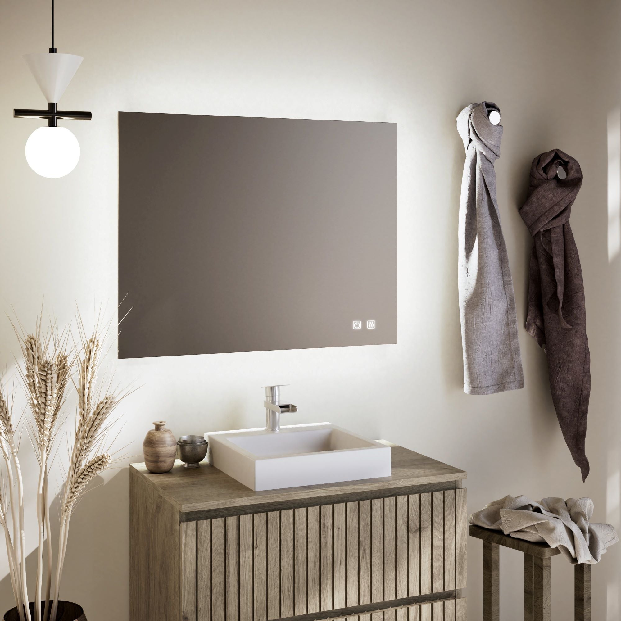 DESIGN ELEGANTE E MODERNO: Com sua forma retangular e acabamento sofisticado, este espelho de 90 x 70 cm adiciona um toque de estilo e luxo a qualquer banheiro. ILUMINAÇÃO LED INTEGRADA: Aproveite uma luz uniforme e ajustável, perfeita para maquiagem, fazer a higiene pessoal ou simplesmente criar um ambiente acolhedor no seu banheiro. FUNÇÃO ANTIVAPOR: Esqueça o vapor após o banho. Sua tecnologia antivapor mantém o espelho sempre claro, garantindo visibilidade perfeita o tempo todo. ALTO-FALANTES BLUETOOTH INTEGRADOS: Conecte-se facilmente via Bluetooth e curta sua música favorita, podcasts ou chamadas com som envolvente graças aos alto-falantes ocultos na parte traseira. EFICIÊNCIA E CONFORTO: Equipado com desligamento automático para otimizar o consumo de energia e prolongar a vida útil do espelho. Um espelho inovador que combina funcionalidade e tecnologia para transformar sua rotina diária.