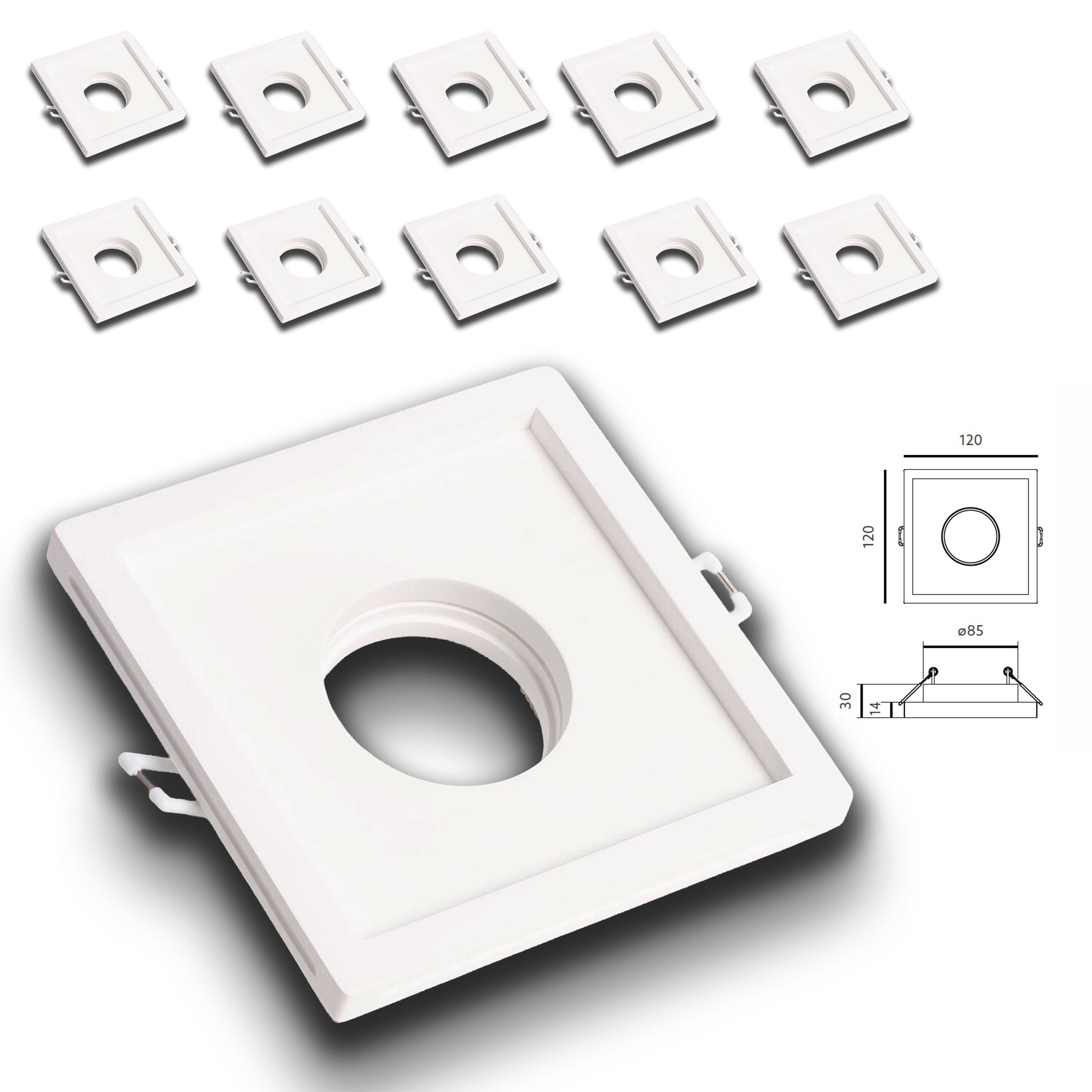 *ESTOQUE* 10 pacotes de suporte de projetor de encastrar em gesso cerâmico 120x120x45mm com orifício redondo 40W GU10 IP20
