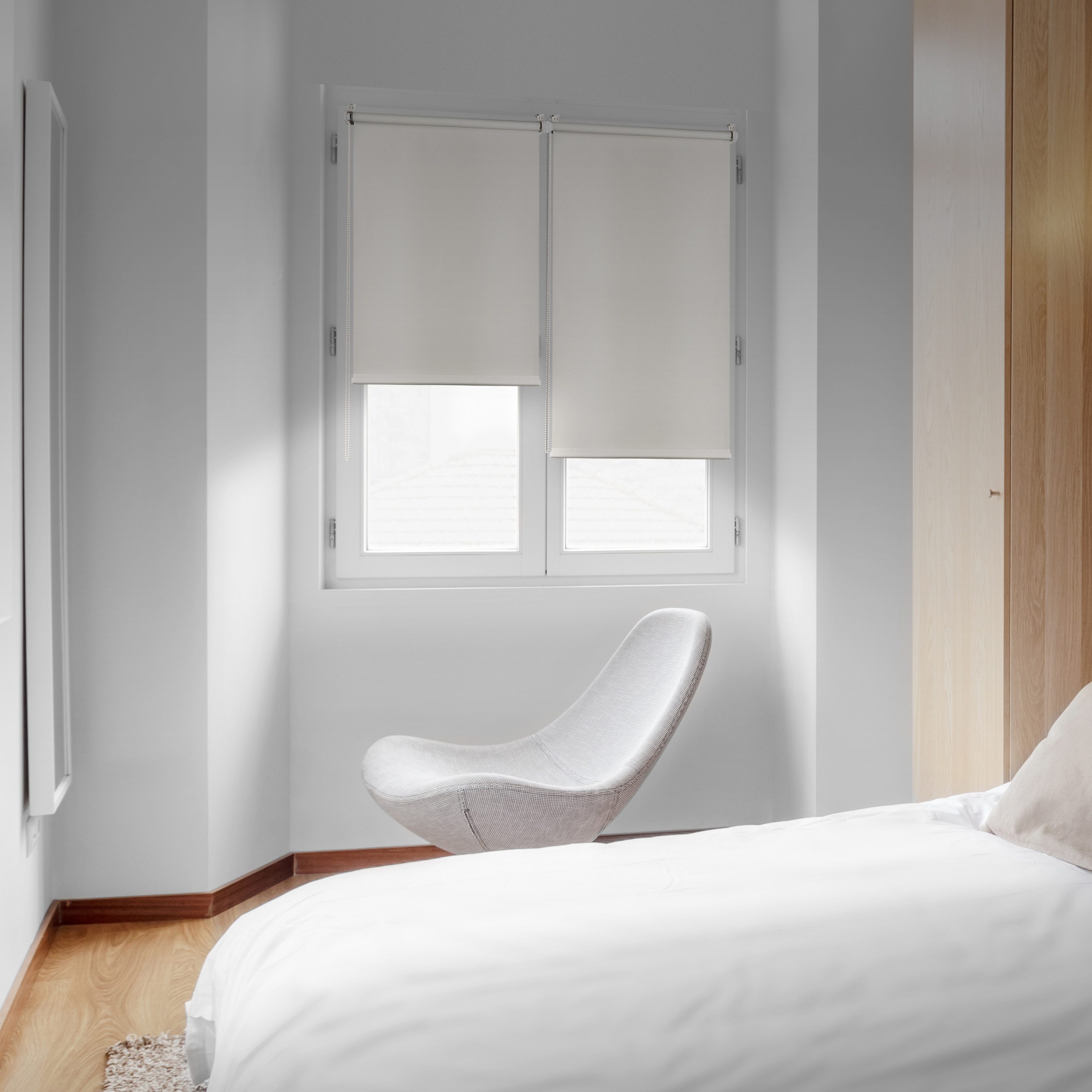 Estore de Rolo em tecido opaco que bloqueia completamente a luz. Pragmático e versátil devido às suas diferentes opções de instalação. Possibilidade de instalação convencional no teto ou na parede, ou de instalação no caixilho da janela em PVC ou alumínio, sem necessidade de furar. Opção de bloqueio inferior que impede o movimento livre do estore. Todos os acessórios necessários estão incluídos.