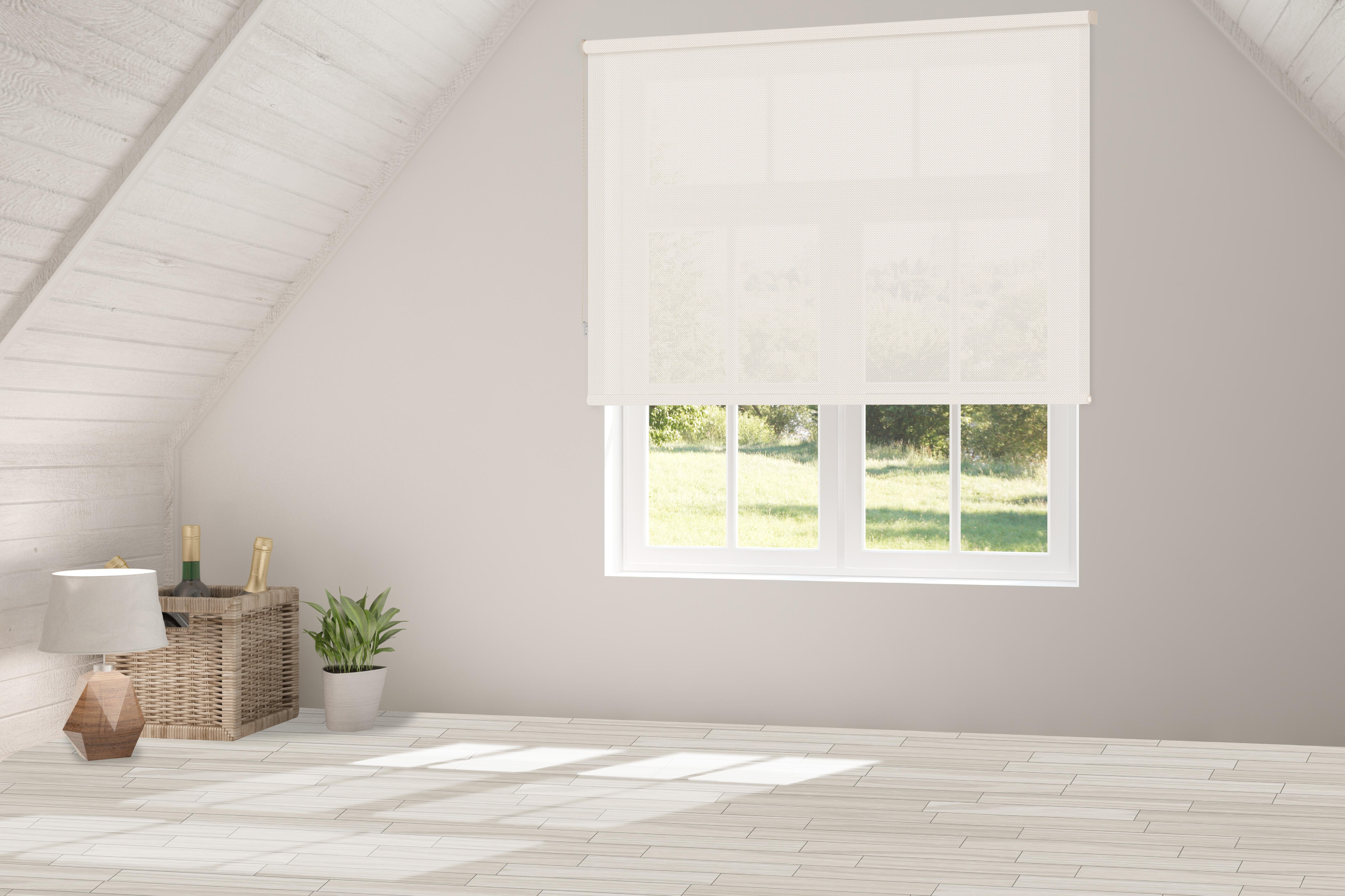 Estor de rolo semi-translúcido com design liso branco linho. Proteção térmica e UV e protege de olhares indiscretos.