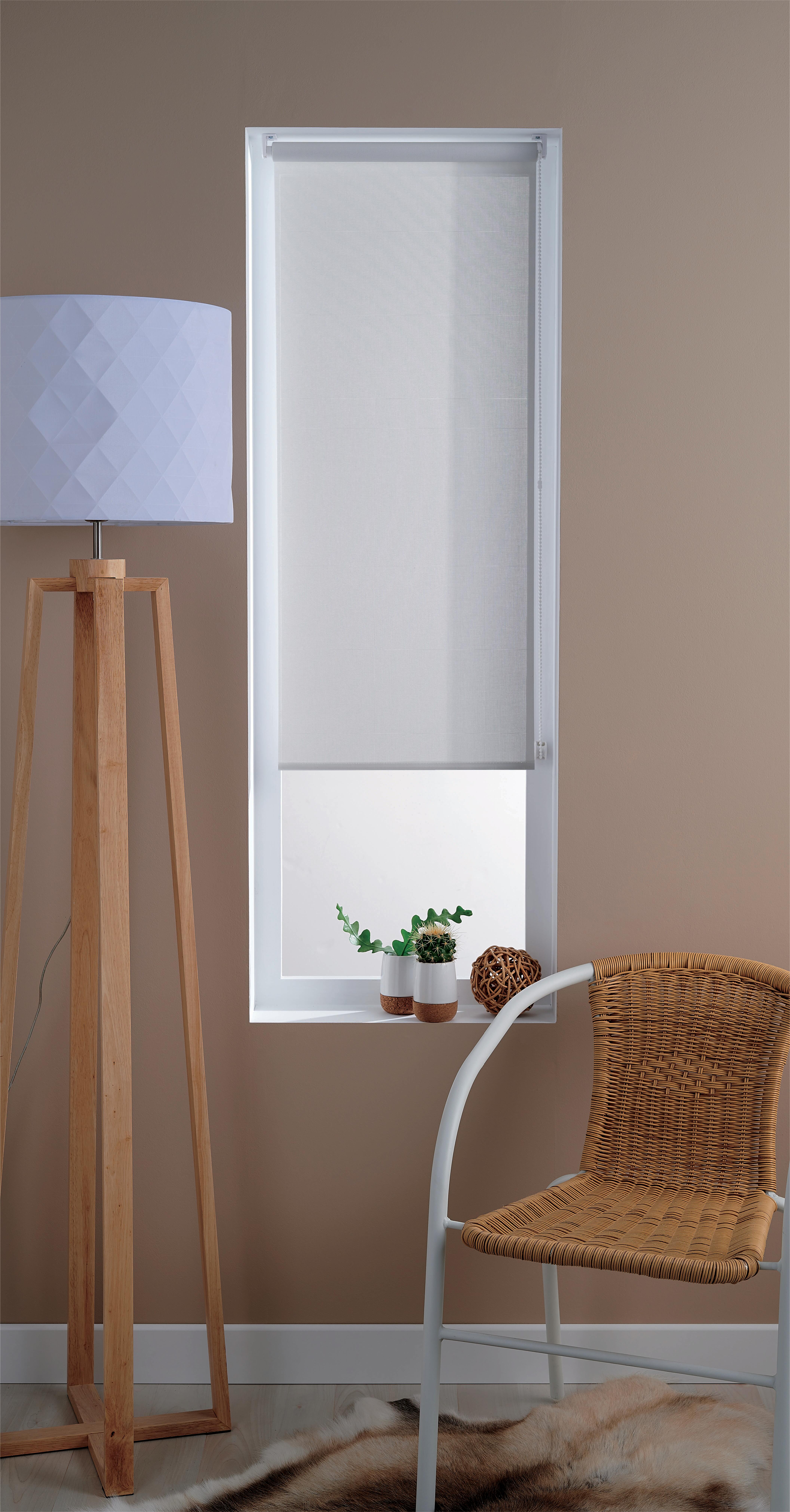 Estor de rolo opaco com design liso branco linho. Proteção térmica e UV e protege de olhares indiscretos.