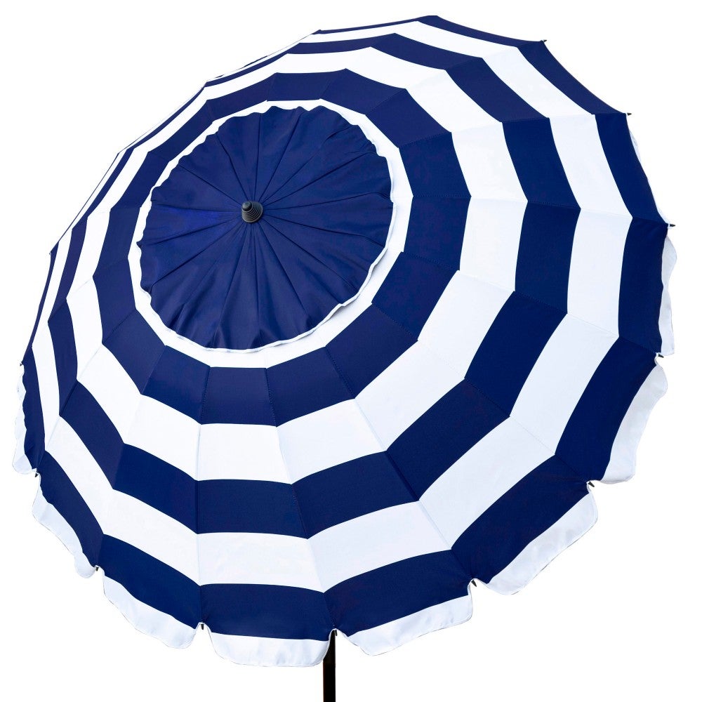 Guarda-sol Aktive Beach de alta qualidade resistente a fortes rajadas de vento, com um design de marinheiro listrado azul e branco. Tem um arco de 240 cm de diâmetro e um mastro de altura ajustável de 29/32 mm de diâmetro. O guarda-sol é feito de material de poliéster com proteção UV50 e revestimento prateado e seu mastro inclinável para direcionar a sombra é feita de alumínio. É ultra resistente ao vento, pois inclui respiro superior para deixar o ar passar e 16 varetas de fibra de vidro que seguram o toldo. Inclui armazenamento e bolsa de transporte com alça.