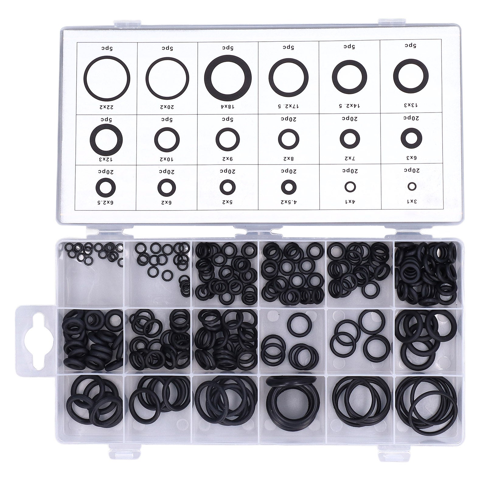 - Kit completo: 225 peças em tamanhos variados para todas as necessidades de vedação.