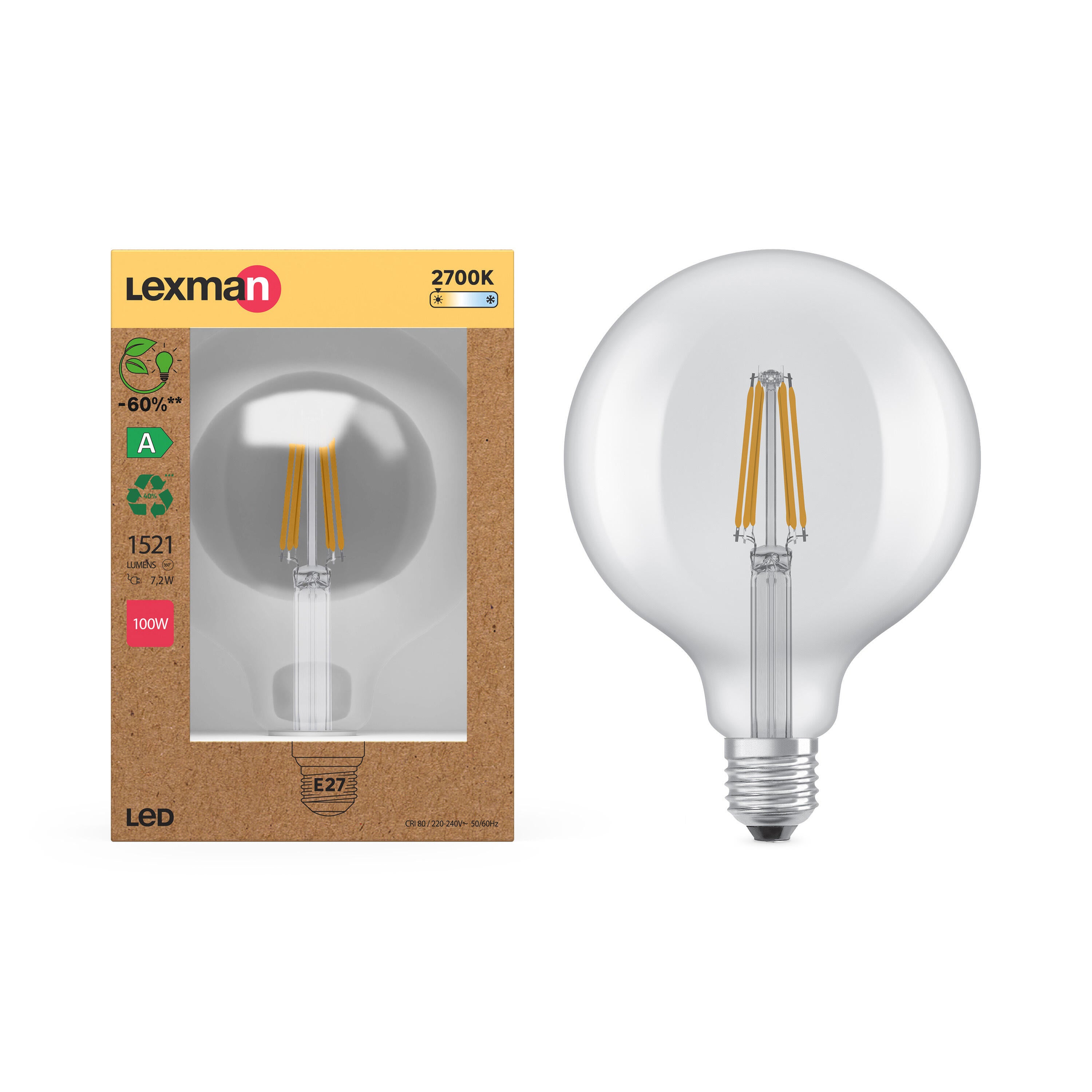 Lâmpada globo LED, 125 mm de diâmetro, com base de rosca grande (E27). Esta lâmpada possui uma reprodução de cor branco quente (2700 K) e consome 60% menos energia do que uma lâmpada de 17,8 watts da classe energética F, graças à sua classe energética A. Esta lâmpada tem uma saída de 1521 lúmens, o que equivale a 100 watts de energia, mas consome apenas 7,2 watts. Esta lâmpada LEXMAN tem uma vida útil de 50.000 horas. Garantia de 5 anos. Um pequeno extra: esta lâmpada utiliza 40% de vidro reciclado em sua fabricação.