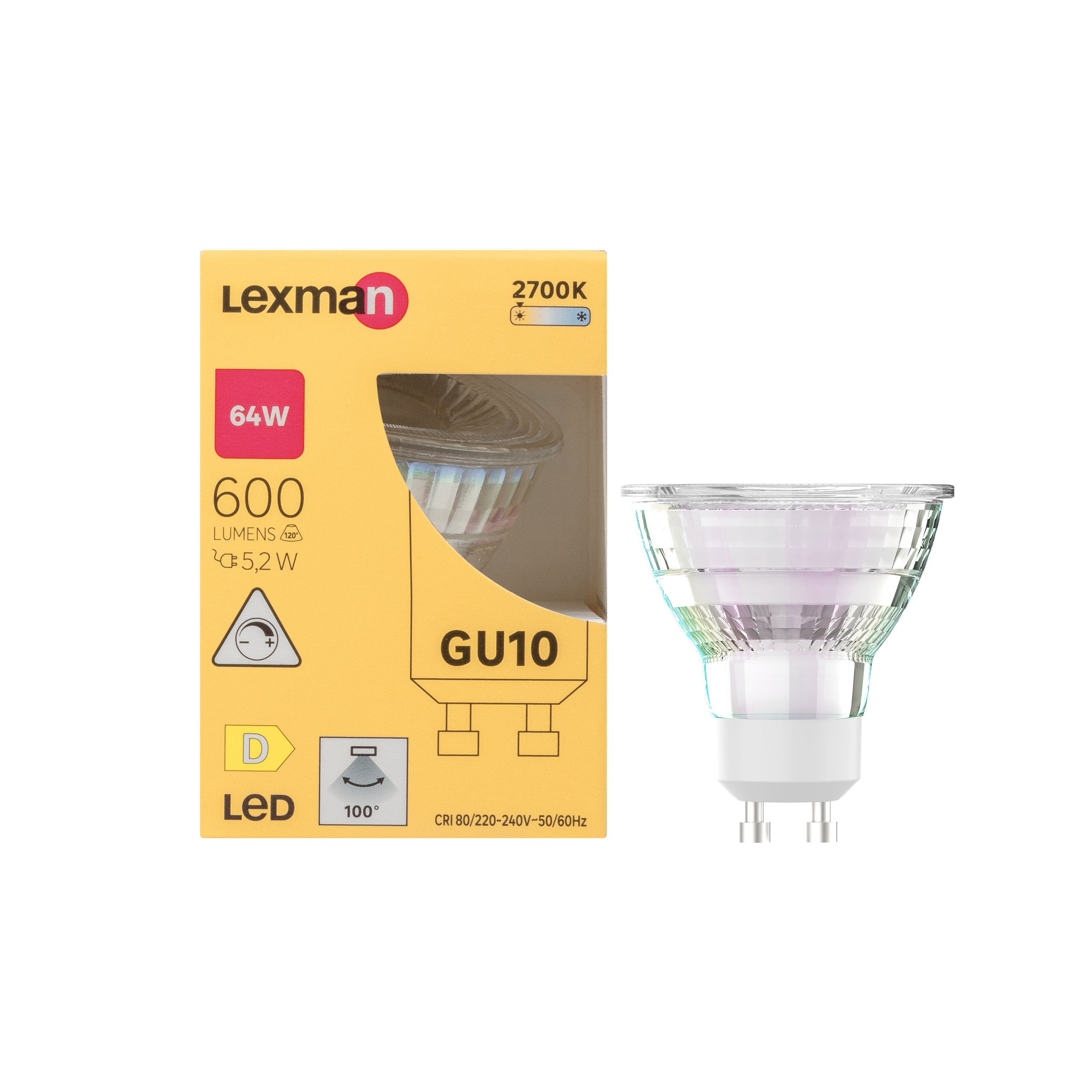 Lâmpada refletora GU10 com ângulo de distribuição de luz de 100 graus (luz difusa). Sua temperatura de cor branca quente (2700K) proporciona uma atmosfera acolhedora ao seu ambiente. Ajuste a intensidade da luz graças à sua função dimerizável com dimmer. Esta lâmpada tem uma potência de 600 lúmens ou equivalente em Watts: 64W, mas consome apenas 5,2 watts graças à tecnologia LED. Esta lâmpada LEXMAN tem uma vida útil de 25.000 horas. Garantia de 5 anos.