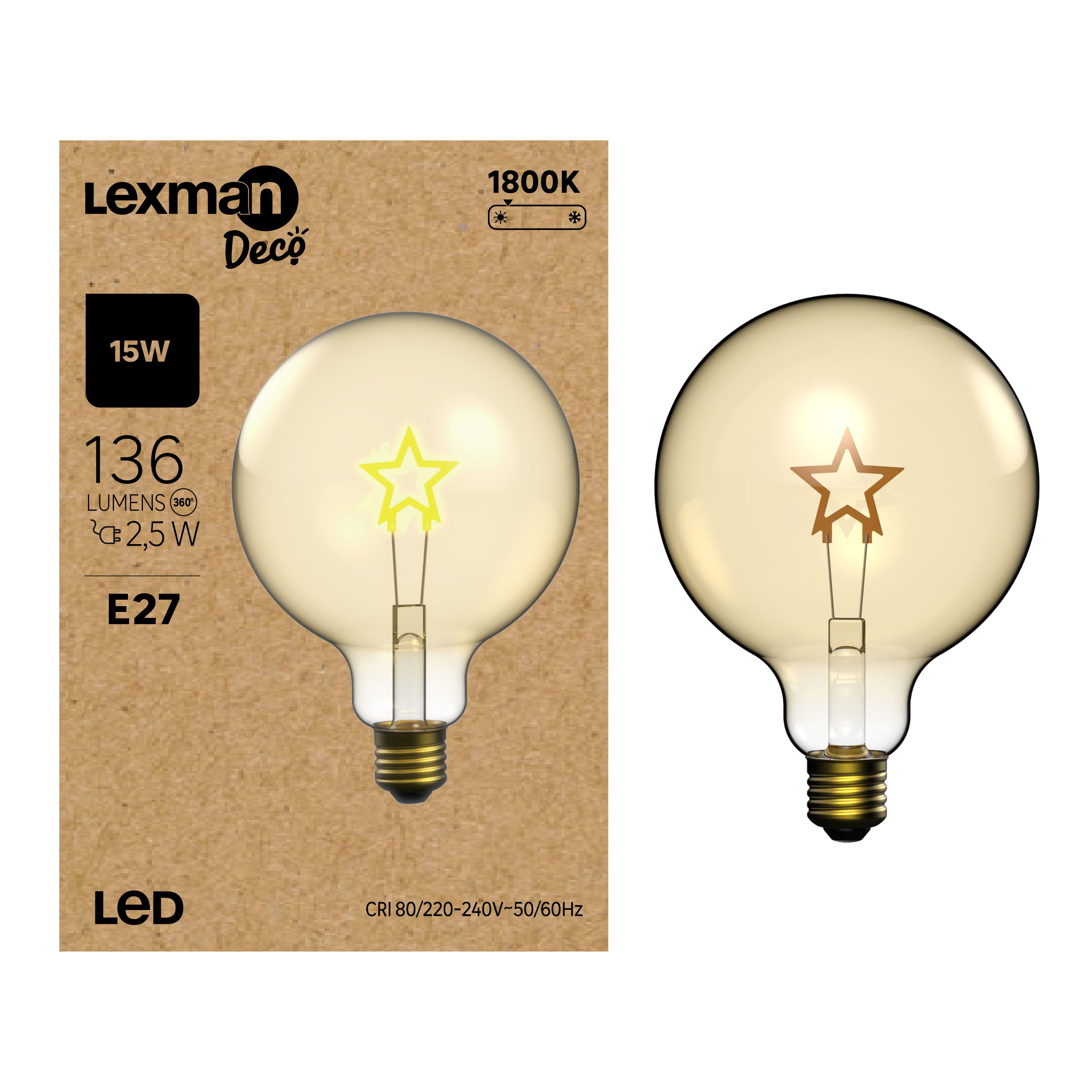 Lâmpada LED decorativa âmbar, 125 mm de diâmetro, com base de rosca grande (E27). Os filamentos desta lâmpada formam o desenho de uma estrela para dar um toque de originalidade aos seus interiores. Esta lâmpada possui uma reprodução de cor branco quente (1800K). Possui uma potência de 136 lúmens, equivalente a 15 Watts, mas consome apenas 2,5 Watts. Este produto tem garantia de 5 anos.