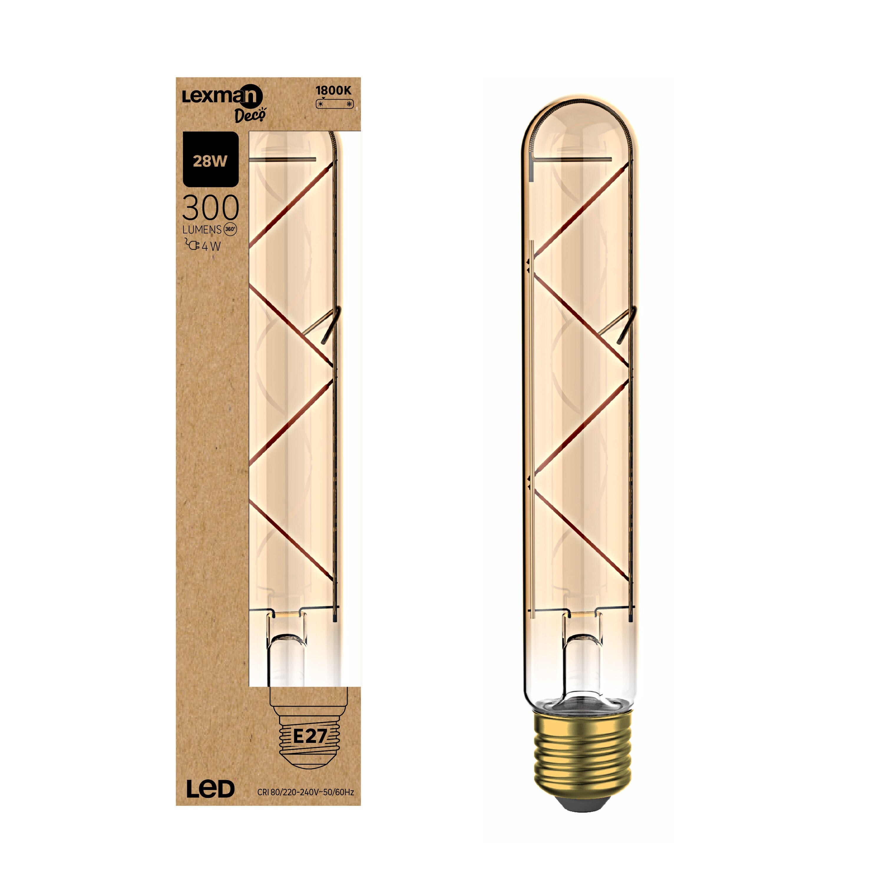 Lâmpada LED decorativa âmbar, 185 mm de comprimento, com base de rosca grande (E27). Esta lâmpada tem uma reprodução de cor branco quente (2000K). Possui uma potência de 300 lúmens, equivalente a 28 Watts de energia, mas consome apenas 3,5 Watts. Garantia de 5 anos.