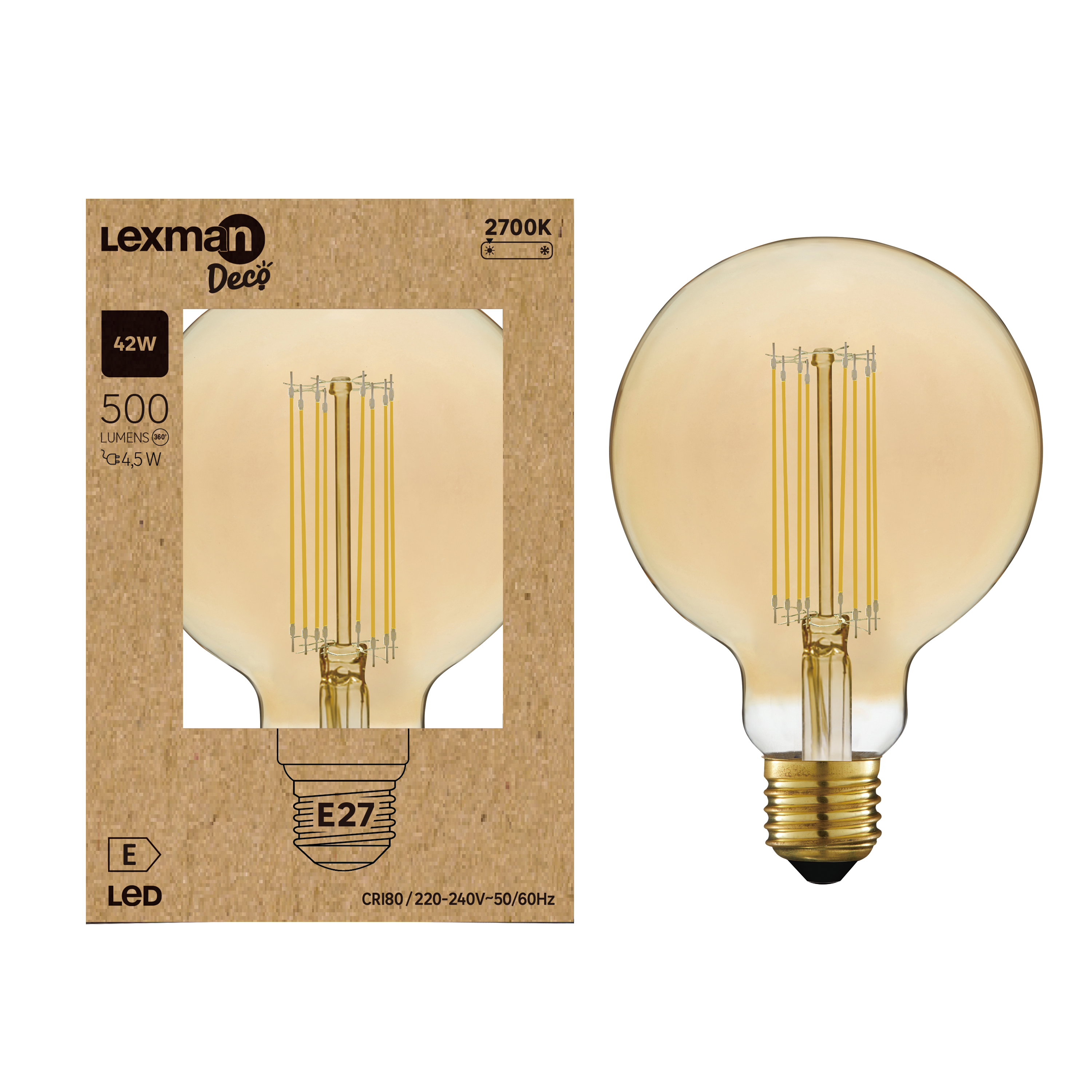 Lâmpada LED globo decorativa âmbar, 95 mm de diâmetro com base de rosca grande (E27). Esta lâmpada tem uma reprodução de cor branco quente (2700K). Possui uma potência de 500 lúmens, equivalente a 42 Watts, mas consome apenas 4,5 Watts. Este produto é classe energética E e possui garantia de 5 anos.