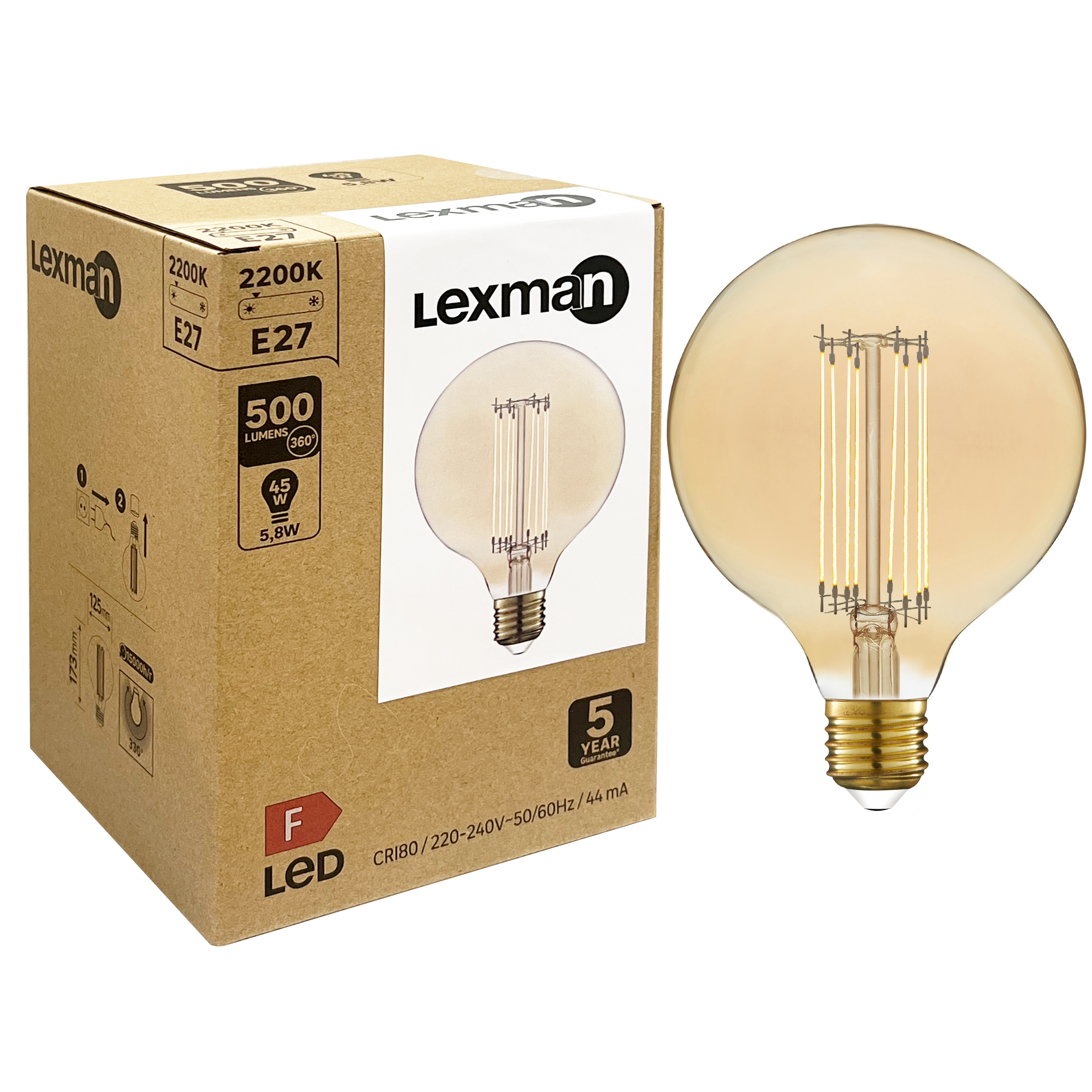Lâmpada globo de 125 mm de diâmetro com filamentos mais finos e esteticamente mais agradáveis do que as lâmpadas de antigamente (Globe 125), com base de rosca grande (E27), temperatura de cor branca quente (2700 Kelvin), 500 lúmens, lâmpada âmbar, garantia de 5 anos