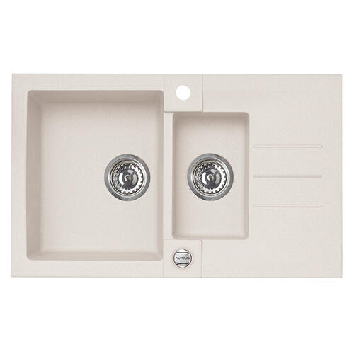 Lava-louça de uma cuba e meia com escorredor, da marca ALVEUS no modelo Rock 70, em material de granito e resina ns cor branco com acabamento mate. Recomendado para instalação em bancadas de granito, pedra ou sintético. Este material possui altíssima resistência ao impacto e ao calor, protege a superfície com tratamento antibacteriano. O seu design dará à sua cozinha um elemento decorativo e também prático. Medidas: 78x48 cm