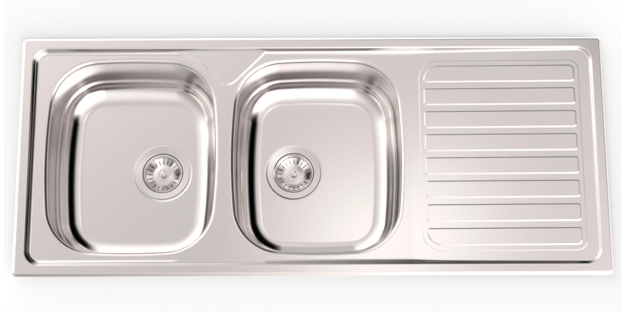 Lava-louça Rodi modelo FLAT em aço inoxidável de duas cubas, com escorredor. Medida 50x120cm, colocação de encastrar. Redução em cerca de 60% de cartão nas embalagens.