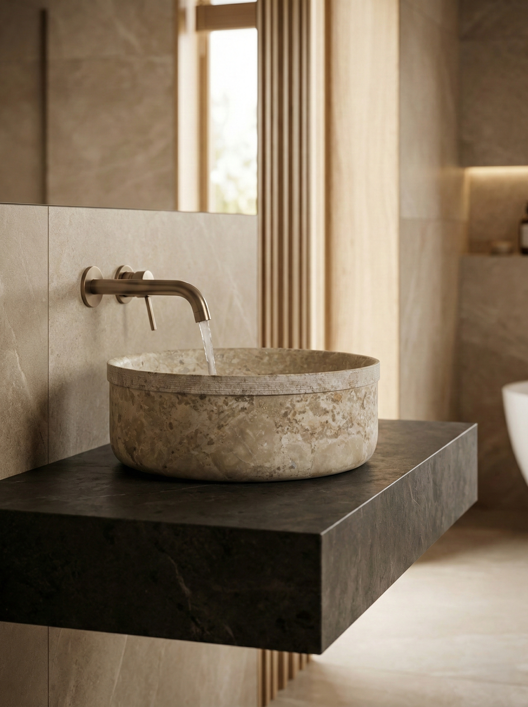 O lavatório de pedra natural bege AUSTIN combina design contemporâneo e a solidez de um material autêntico. O seu acabamento artesanal realça a beleza única da pedra, criando espaços elegantes e intemporais. Resistente e duradouro, este lavatório oferece calor e distinção à casa de banho, garantindo qualidade, funcionalidade e harmonia natural em cada detalhe.