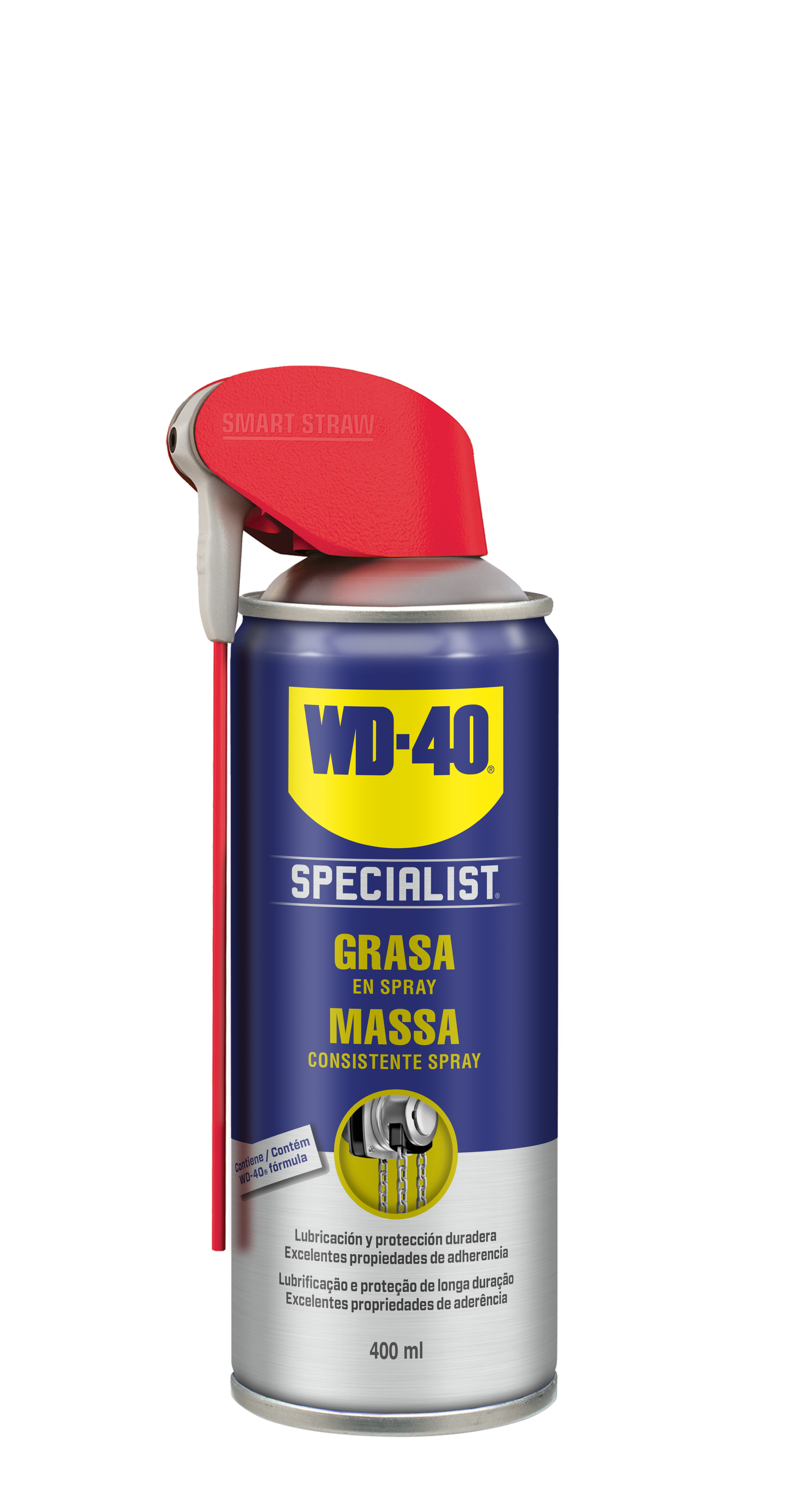 A Massa em Spray WD-40 Specialist é um produto altamente versátil para lubrificar e proteger superfícies em metal contra a humidade e a ferrugem. A sua fórmula contém WD-40 Multiusos em formato gel excelente para aplicar em superfícies verticais. Excelente para usar em superfícies de metal com metal para uma lubrificação e proteção contra a água imbatíveis. Perfeita para utilizar de forma preventiva para proporcionar uma proteção contra a ferrugem, a corrosão, o desgaste e emperramento. Adequado para aplicar em qualquer tipo de superfície em metal. Graças à sua fórmula de alta viscosidade não pinga nem escorre e fica no local onde foi aplicado. Com o aplicador de Dupla Ação poderá escolher entre duas formas de pulverizar: utilize a cânula para aplicar o produto em áreas específicas ou de difícil acesso e rode para baixo para utilizar a boquilha de pulverização de grande ângulo para cobrir áreas de maiores dimensões.