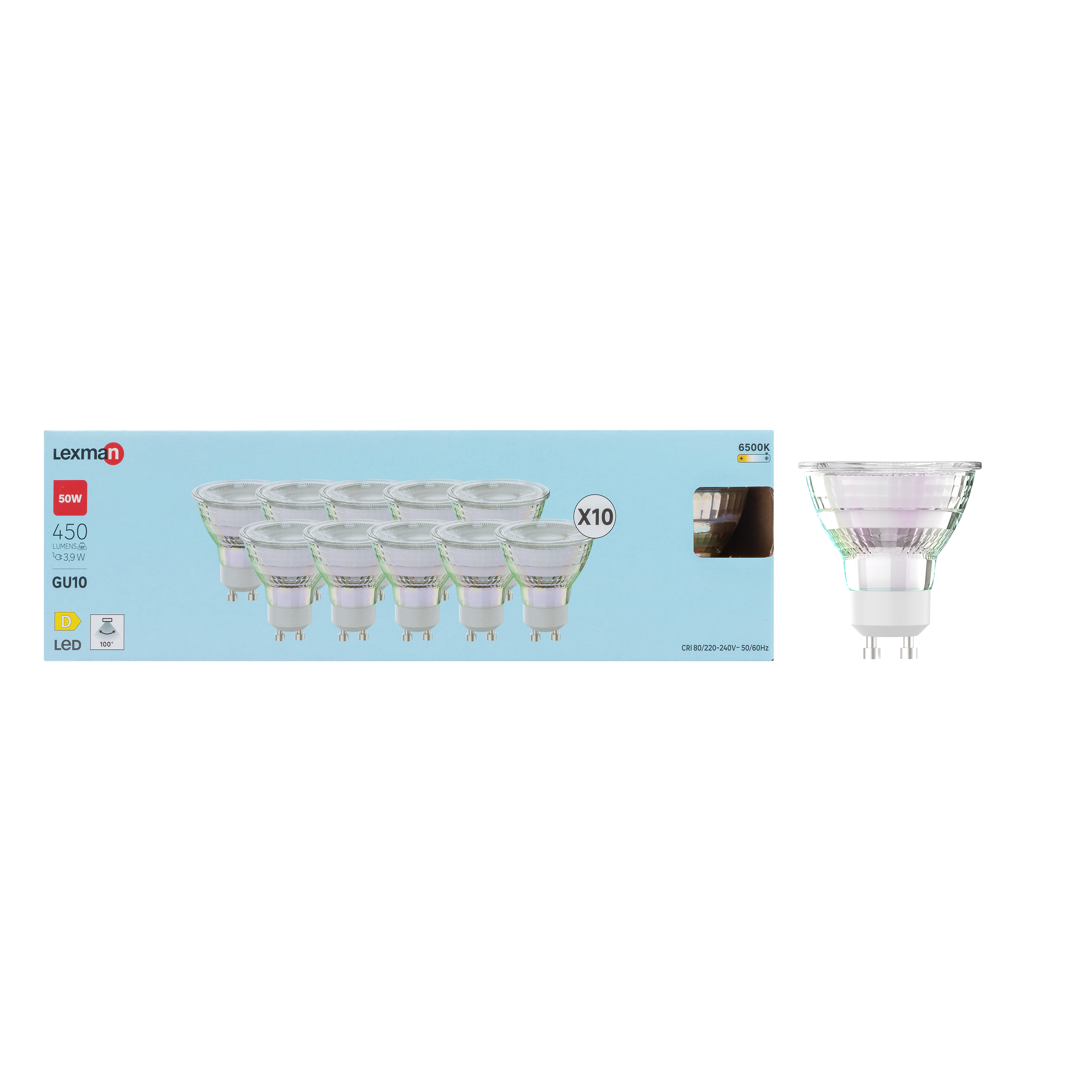 Pacote com 10 lâmpadas refletoras GU10 com ângulo de distribuição de luz de 100 graus (luz difusa). Ideal para holofotes embutidos. Esta lâmpada, com sua temperatura, terá uma reprodução de cor branca fria (6500K). Esta lâmpada LED tem uma potência de 450 lúmens, equivalente a 50 Watts de energia, mas consome apenas 3,9 Watts. Este produto é classe energética D e possui garantia de 5 anos.