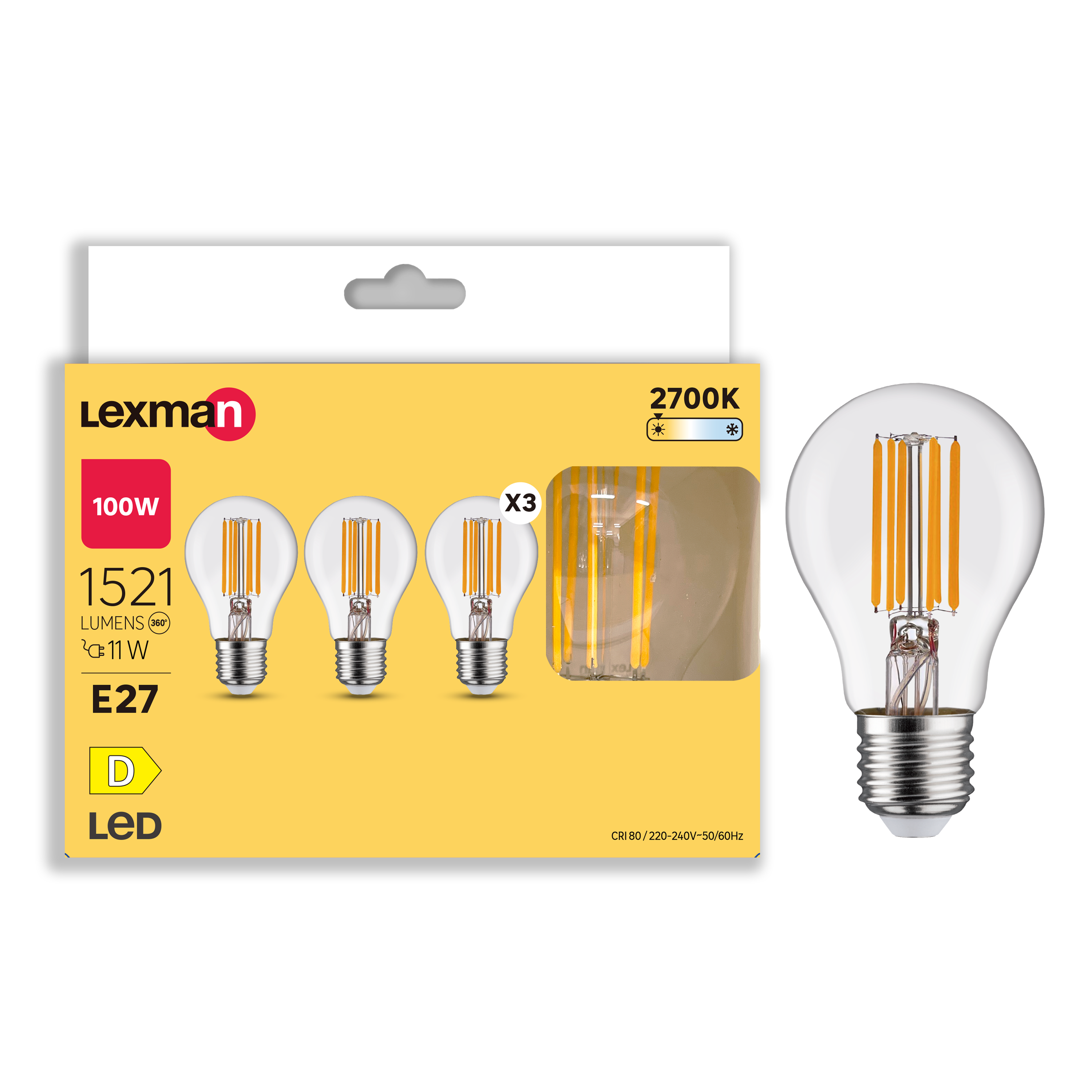 Pacote com 3 lâmpadas LED de formato padrão (A60) com base grande de rosca (E27). Estas lâmpadas têm uma reprodução de cor branco quente (2700K), que proporcionará uma atmosfera acolhedora aos seus ambientes. Elas têm uma potência de 1521 lúmens, o que equivale a uma energia de 100 watts; mas consomem apenas 11 watts. Estas lâmpadas LEXMAN têm uma vida útil de 25.000 horas. Garantia de 5 anos.