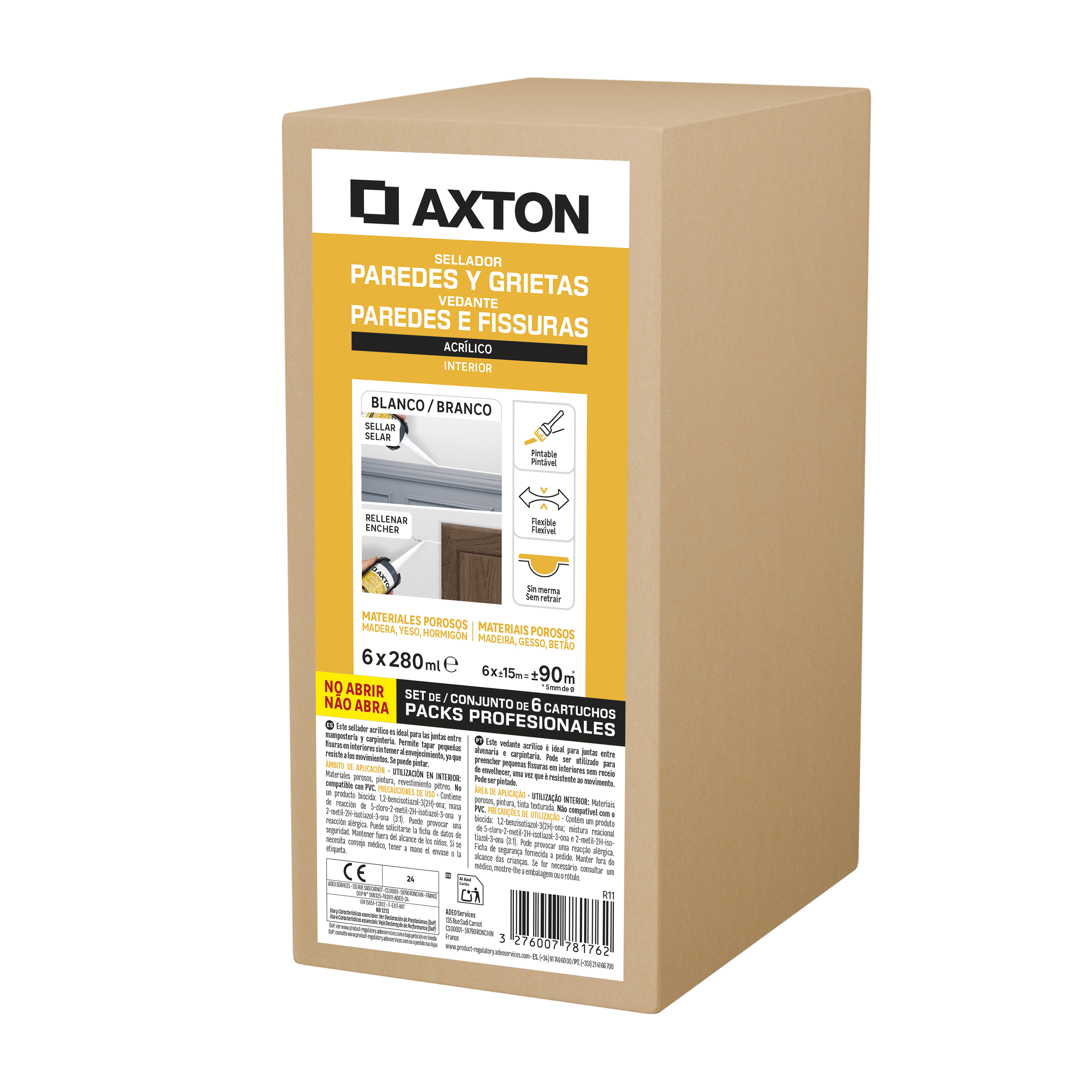 Este selante de acabamento acrílico branco Axton para paredes e fissuras é ideal para fazer juntas de ligação entre 2 superfícies ou para preencher pequenas fissuras em interiores. Particularmente recomendado antes da aplicação de tintas para um acabamento perfeito, sua fórmula flexível garante um resultado duradouro sem medo de movimentos do substrato. A textura deste selante facilita o alisamento uniforme, sem encolher ao secar. Pintável. Pode ser aplicado em materiais porosos (madeira, gesso, cimento, concreto, etc.), tintas e gesso. Não compatível com PVC. Compatível com pistola Dexter