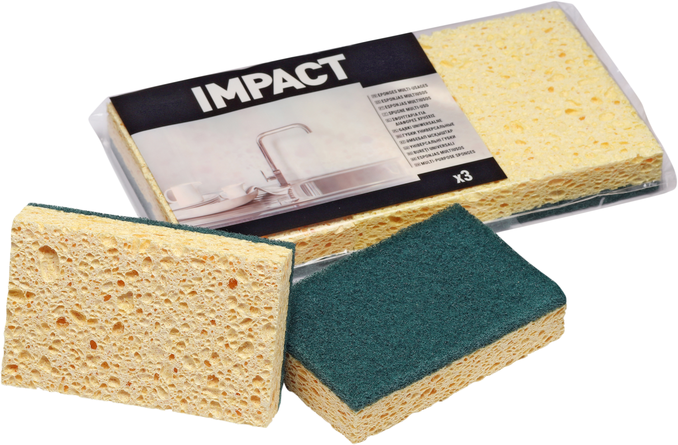 Pack de 3 esfregões abrasivos com esponja IMPACT perfeitas para limpar qualquer tipo de superfície independente do contorno, pois se adapta e pode atingir todos os tipos de ângulos. Disponível em pack de 3 e pack de 10.