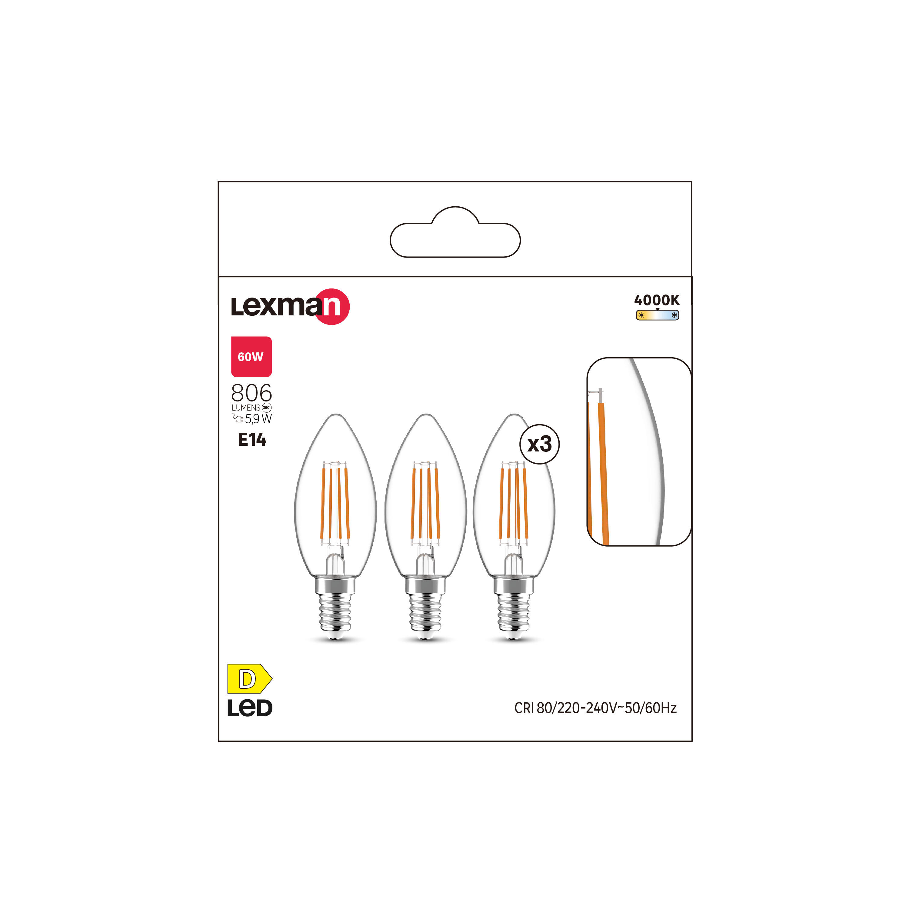 Este pacote com três lâmpadas de vela padrão de 35 mm de diâmetro possui temperatura de cor branca neutra (4000 K). Esta lâmpada tem uma potência de 806 lúmens, o que equivale a 60 watts de energia, mas consome apenas 5,9 watts. Esta lâmpada LEXMAN tem uma vida útil de 25.000 horas. Garantia de 5 anos.