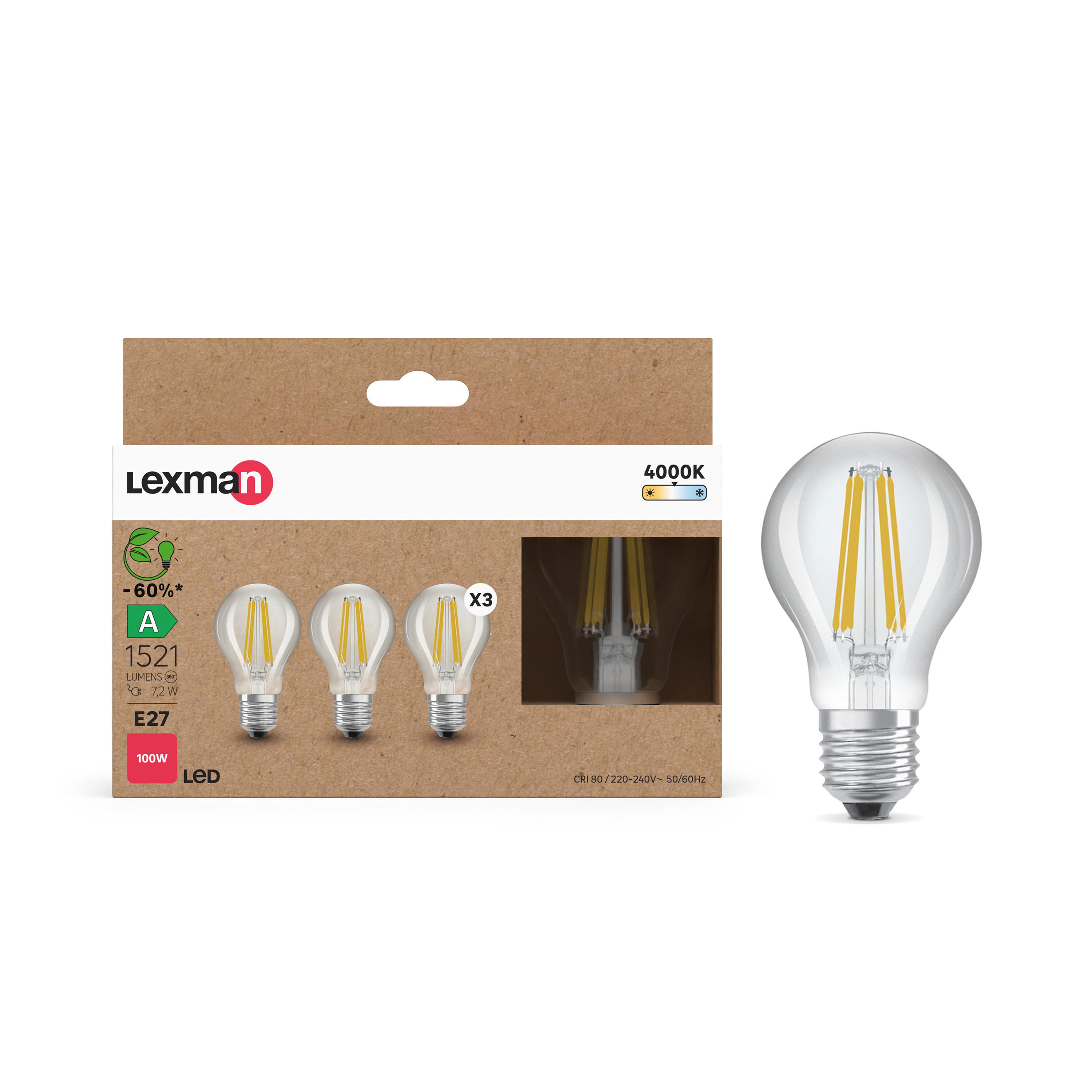 Lâmpada LED branca padrão, 60 mm de diâmetro com base de rosca grande (E27). Esta lâmpada possui uma reprodução de cor branca neutra (4000K). Possui uma potência de 1521 lúmens, equivalente a um consumo de energia de 100 Watts, mas consome apenas 7,2 Watts. Consome 60% menos energia do que uma lâmpada de 17,9 W de classe energética F, graças à sua classe energética A. Este produto tem garantia de 5 anos.