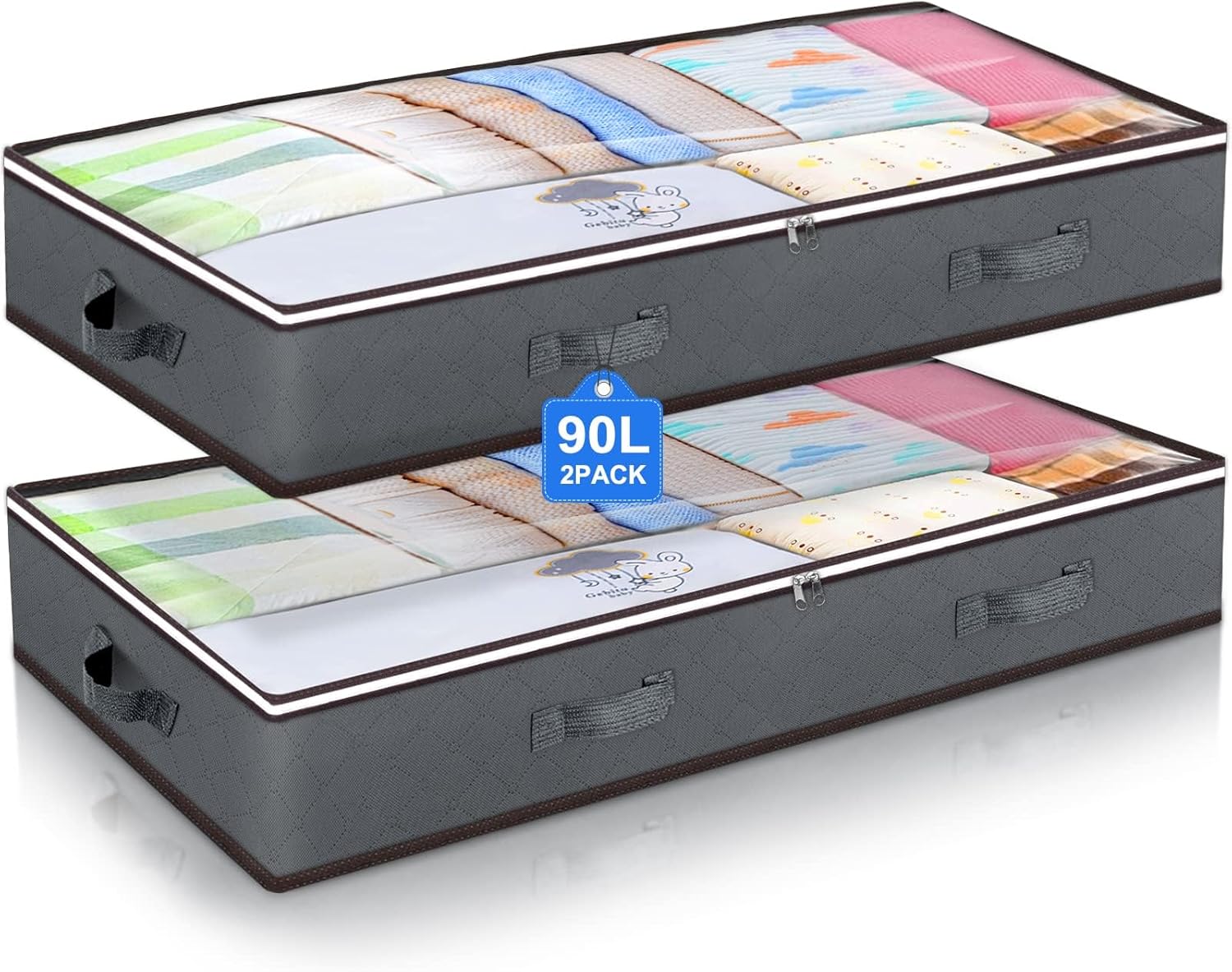 Grande capacidade de 90 L: Cada caixa de armazenamento embaixo da cama tem capacidade de carga de 90 litros. Dimensões: 100 cm de comprimento x 50 cm de largura x 18 cm de altura. Projetada para caber na maioria dos espaços embaixo da cama, esta bolsa cúbica é perfeita para armazenar papel de embrulho, cobertores, lençóis, roupas de cama, travesseiros, lençóis, edredons, toalhas, bichos de pelúcia, roupas de estação, sapatos, decorações de Natal, papel de embrulho e outros itens. Ideal para armazenamento no dormitório.