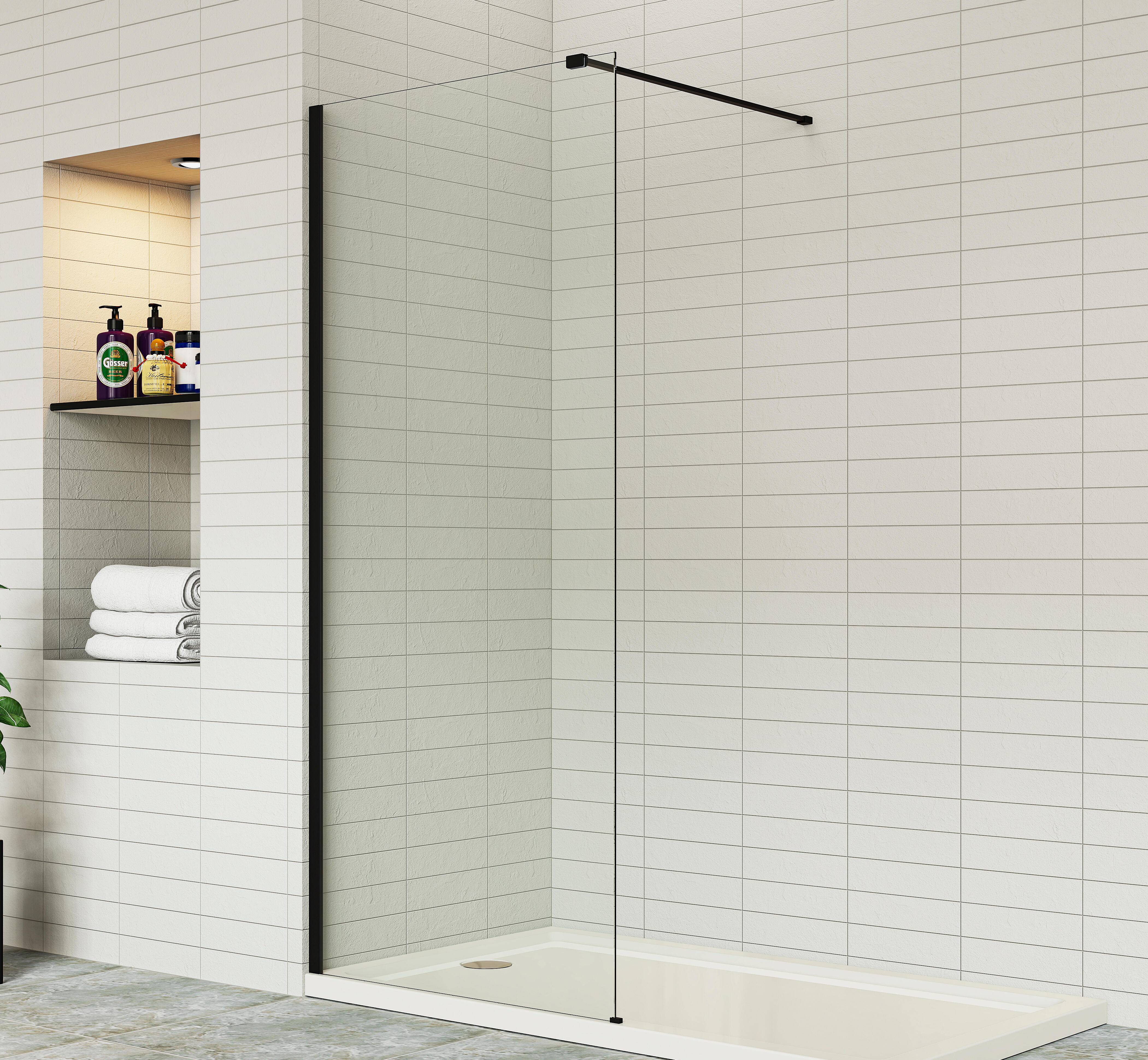 Painel de duche com vidro temperado transparente de 6mm. Medidas de 195cm de altura e 100cm de largura. Calha em alumínio preto.