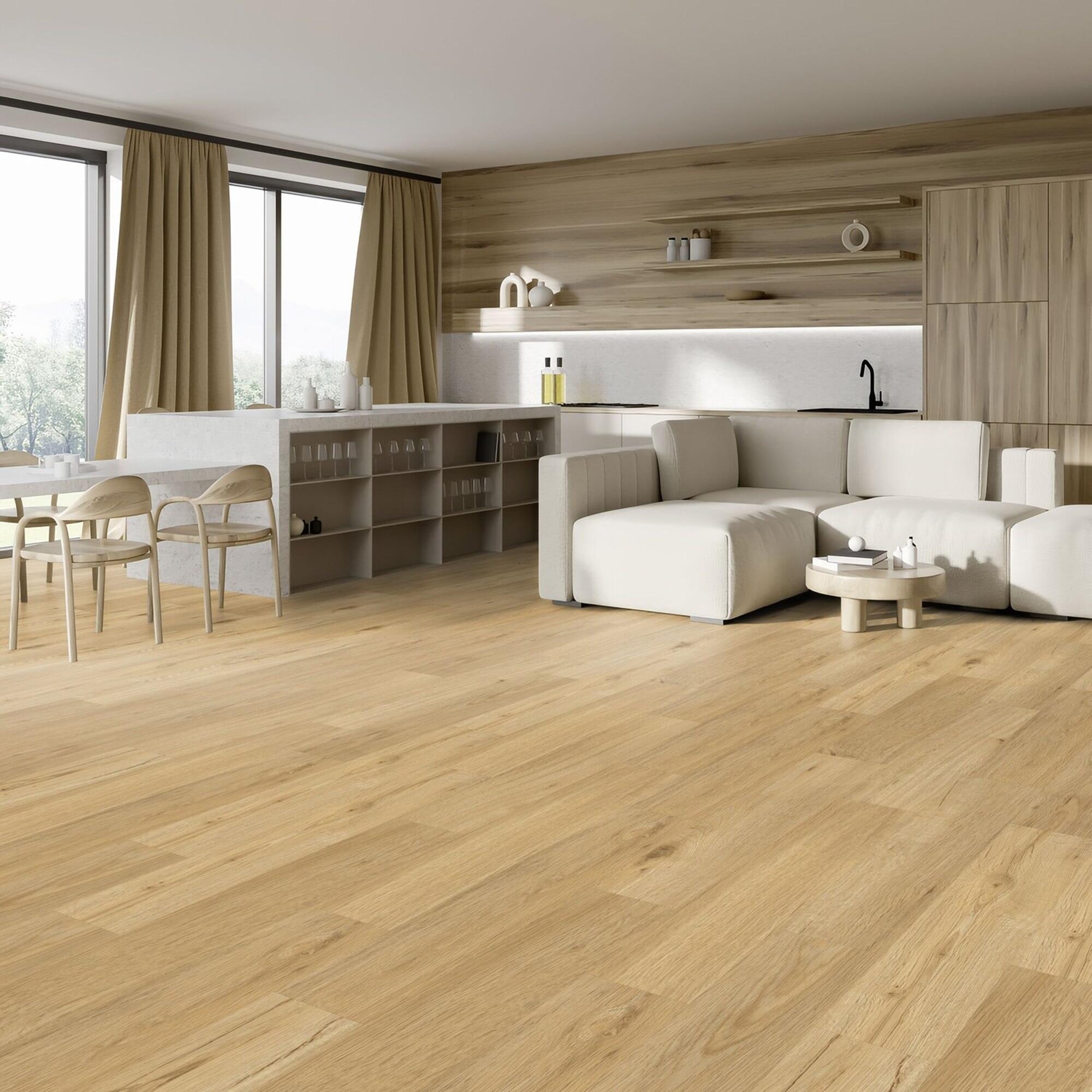 Piso vinílico rígido em clique de PVC em tons claros imitação de carvalho. Série SENSO PREMIUM RIGID ACOUSTIC COLUMBIA XL. Tem uma micro luneta em forma de V com 4 lados. Compatível com piso radiante refrescante e salas húmidas. Instalação de clique flutuante. Pode ser colocado diretamente no pavimento cerâmico se as juntas tiverem menos de 8 mm de espessura e 3 mm de profundidade. Camada de desgaste de 0,55 mm. Base acústica embutida.Nova tecnologia RCB: 21db, 30% mais leve, 100% Reciclável. Medidas: 22,9x149,2 cm (largura/comprimento). Vendido em caixas de 2,39 m². Produto fabricado na Bélgica. Entrega a palete completa
