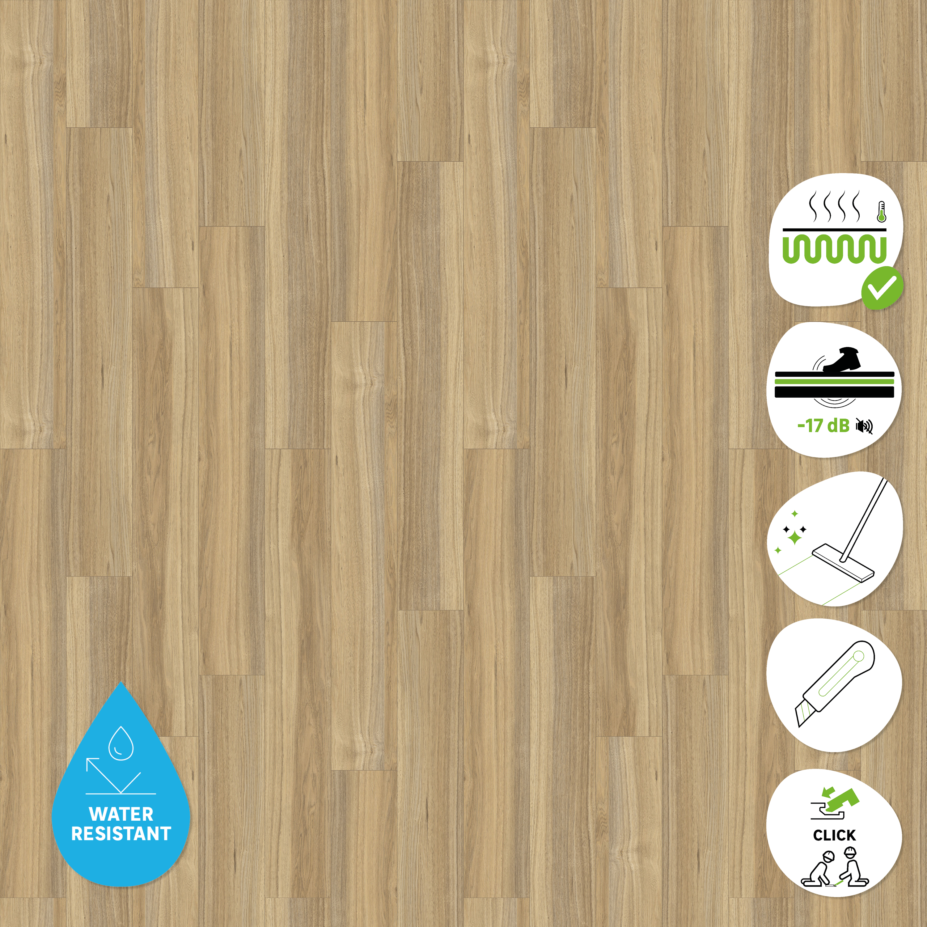 Aquecido e acolhedor, o piso SPC (PVC rígido) Minto 2 da Artens dá ao seu lar um estilo inspirado na natureza. Esta imitação de parquet tem uma paleta de cor bege ligeiramente acinzentada, um efeito de madeira que reproduz as veias de uma espécie de madeira real e um ligeiro relevo que aumenta a sua autenticidade. O sistema de instalação angular requer duas pessoas e garante uma estabilidade ótima. Este piso tem uma camada de isolamento integrada que lhe poupa tempo e proporciona um alto nível de conforto acústico. É compatível com aquecimento por pavimento até 28°C e é resistente à água, bem como ao tráfego de baixa frequência. Prático no uso diário, é fácil de limpar com um pano húmido e um produto neutro. O corte pode ser feito com um simples cortador com uma lâmina nova: são recomendadas 3 passagens da lâmina para facilitar o corte.
