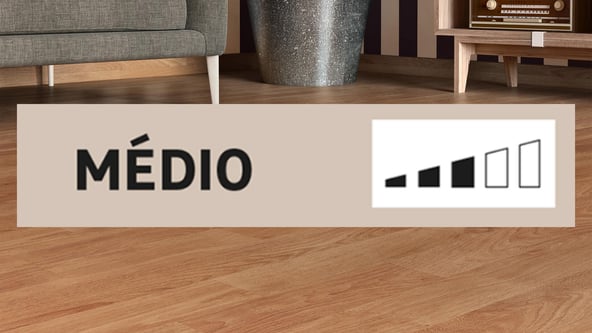 Destinado às divisões não húmidas com uma frequência de passagem elevada, este pavimento flutuante laminado médio pode ser utilizado em espaços como quartos, salas e salas de jantar e corredores. Já apresentamos soluções com 7mm de espessura e todo o chão médio tem uma garantia entre 15 e 20 anos.