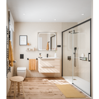 Porta de duche composta por 1 painel fixo e 1 porta de correr. Perfis de alumínio com acabamento preto. Vidro temperado com acabamento transparente, com 8mm de espessura para a porta e 6mm de espessura para o painel fixo, com uma altura de 195cm. Tratamento anti-calcário aplicado no vidro para facilitar a limpeza. Porta de duche reversível para instalação à direita ou à esquerda. Perfis de compensação disponíveis para ganhar até 30mm. Garantia de 10 anos.