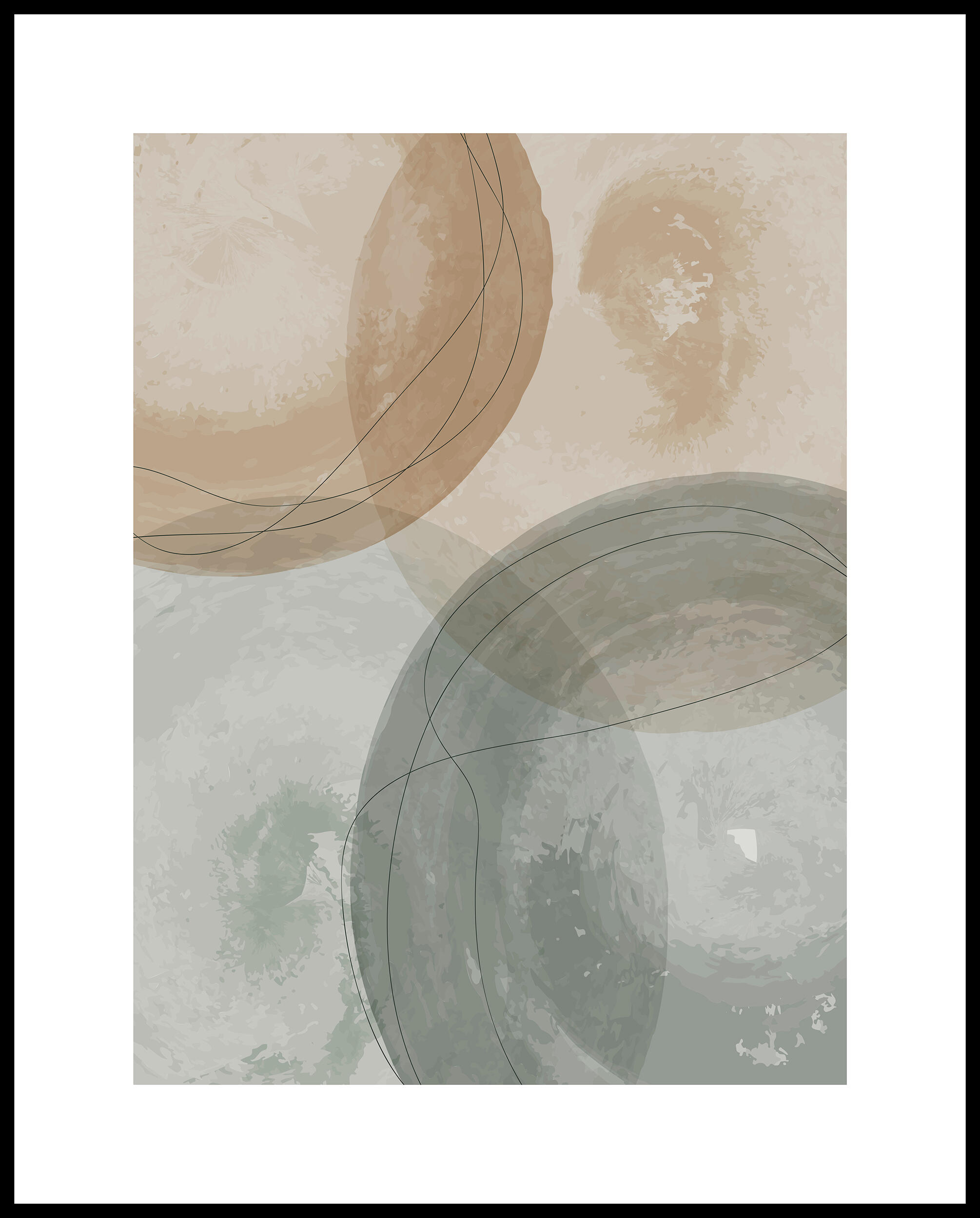 Quadro emoldurado com moldura BCN 20mm na cor preta. Design abstrato em tons de cinza e marrom em forma de círculos. Medida 40x50cm interior.
