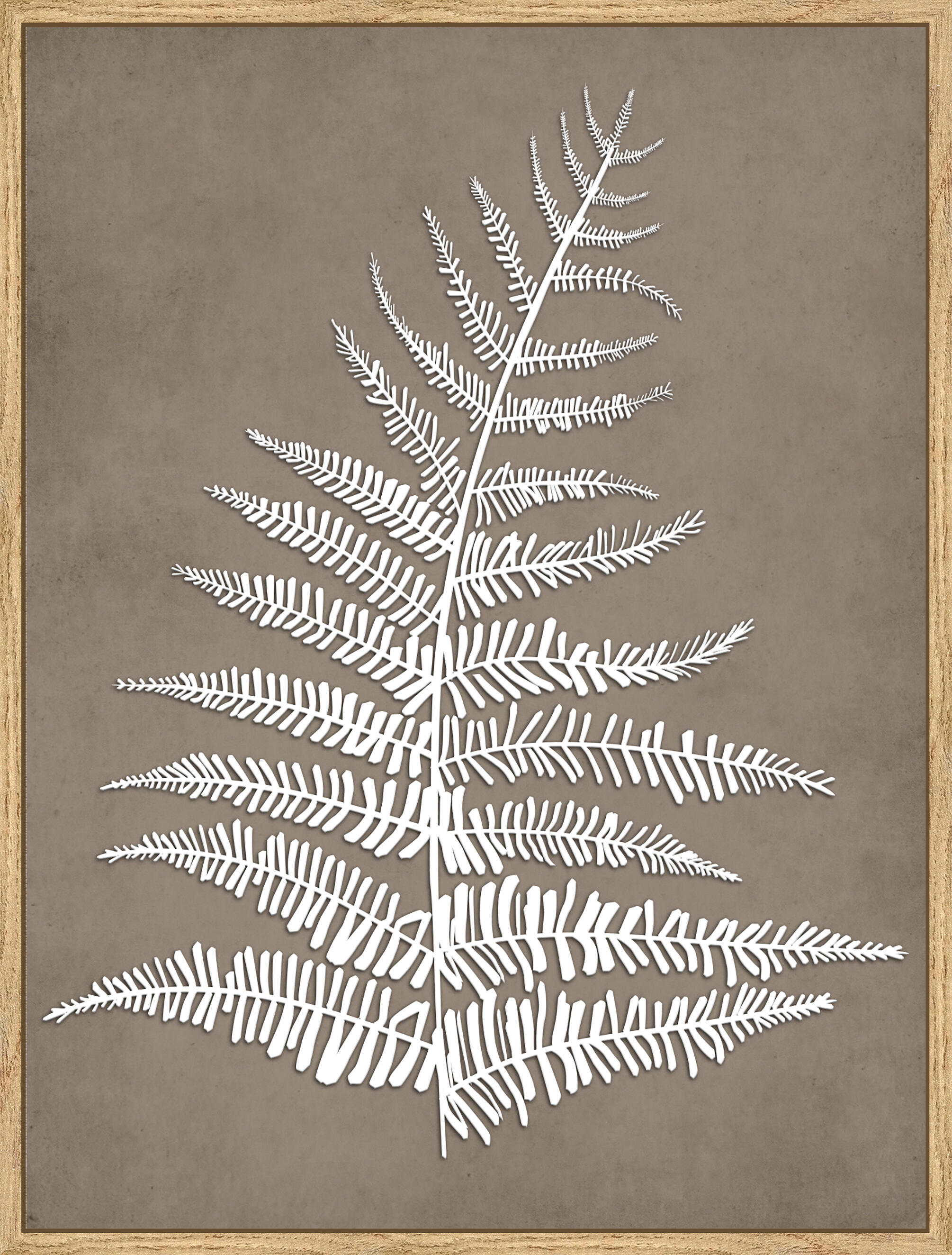 Quadro com moldura decoart 20mm na cor faia G tostada com um design de uma samambaia branca impressa em relevo sobre fundo marrom. Medida 30x40cm interior.