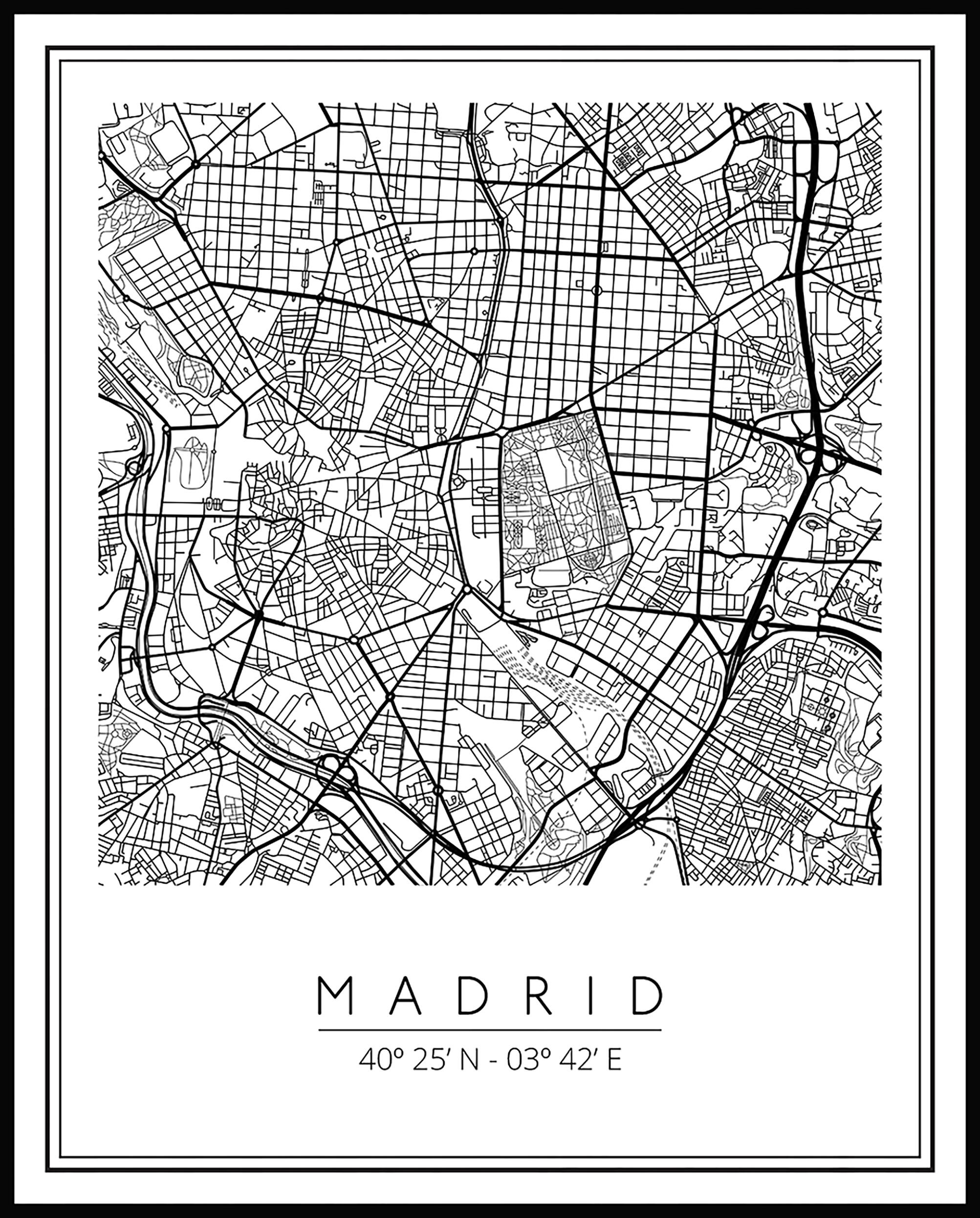 Quadro com moldura decoart 20mm na cor preta com um design impresso em relevo do mapa de Madrid. Medida 40x50cm interior.
