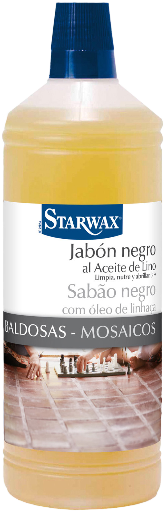 Sabão negro com óleo de linhaça STARWAX , ideal para limpeza de solos interiores. Limpa, nutre e dá brilho às superfícies laváveis, sem enxaguar. Ladrilhos, terracota, pedras naturais, ladrilhos de cimento. Rico em óleo de linhaça. Rendimento: 75 m² aprox. Conteúdo: 1 litro.