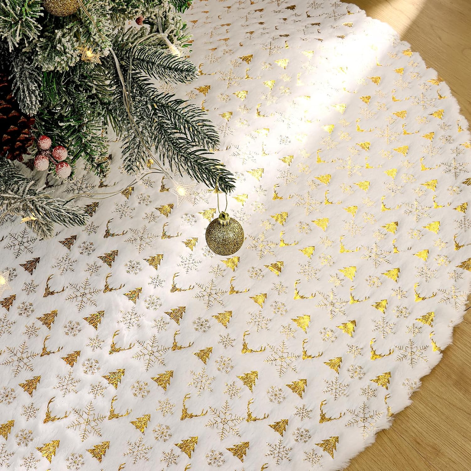 [Material Premium] Feito de pelúcia macia e fofa para um toque confortável, este modelo é meticulosamente trabalhado e durável. Sua superfície é estampada com flocos de neve dourados, árvores de Natal e cabeças de rena, criando um efeito cintilante que ilumina a atmosfera festiva e adiciona um toque de brilho à sua árvore.