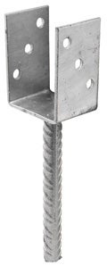 Âncora de poste, em forma de U, para suporte, fixação ou ligação de postes de madeira. Indicado para fixação em betão. Fabricado em aço galvanizado. Medidas: (a) 71 mm; (b) 104 mm; (c) 200 mm: (d) 60 mm. Diâmetro dos furos: 11 mm